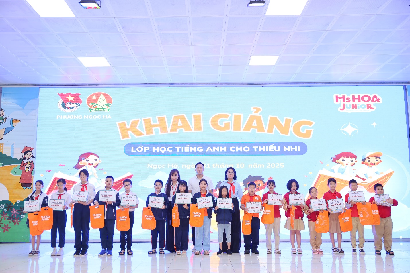 Tại chương trình, 50 suất học bổng Tiếng Anh, mỗi suất gồm phần quà và khóa học trị giá 13 triệu đồng, đã được trao tặng cho 50 em học sinh tiêu biểu đến từ 10 trường Tiểu học và THCS trên địa bàn phường. Những suất học bổng này không chỉ là phần thưởng khích lệ tinh thần học tập, mà còn là cơ hội giúp các em được tiếp cận chương trình học ngoại ngữ hiện đại, rèn luyện kỹ năng giao tiếp, phát âm, tư duy phản xạ và sự tự tin trong môi trường học tập bằng tiếng Anh. Liên đội trường Tiểu học Hoàng Hoa Thám vinh dự chọn cử 5 em học sinh có thành tích học tập xuất sắc để nhận học bổng từ trung tâm và Hội đồng Đội phường Ngọc Hà gồm các em học sinh :
