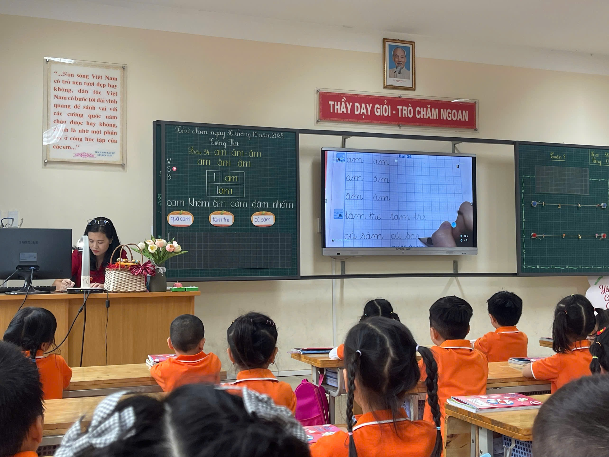 Để giúp học sinh nắm vững các nét chữ và từ khóa trong bài 34: am – ăm - âm, cô đã sử dụng thẻ từ khổ lớn và tổ chức trò chơi "Hái bí ngô", yêu cầu các em di chuyển và ghép vần tạo thành từ đúng. Hoạt động này giúp các em vừa học vừa vận động, tăng cường khả năng ghi nhớ.