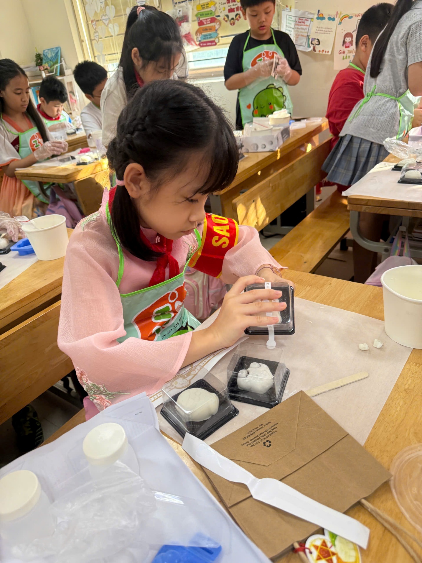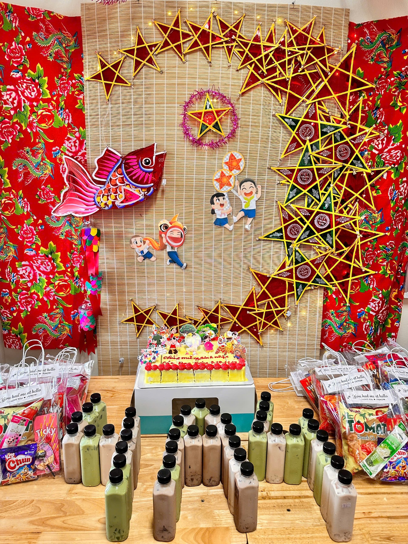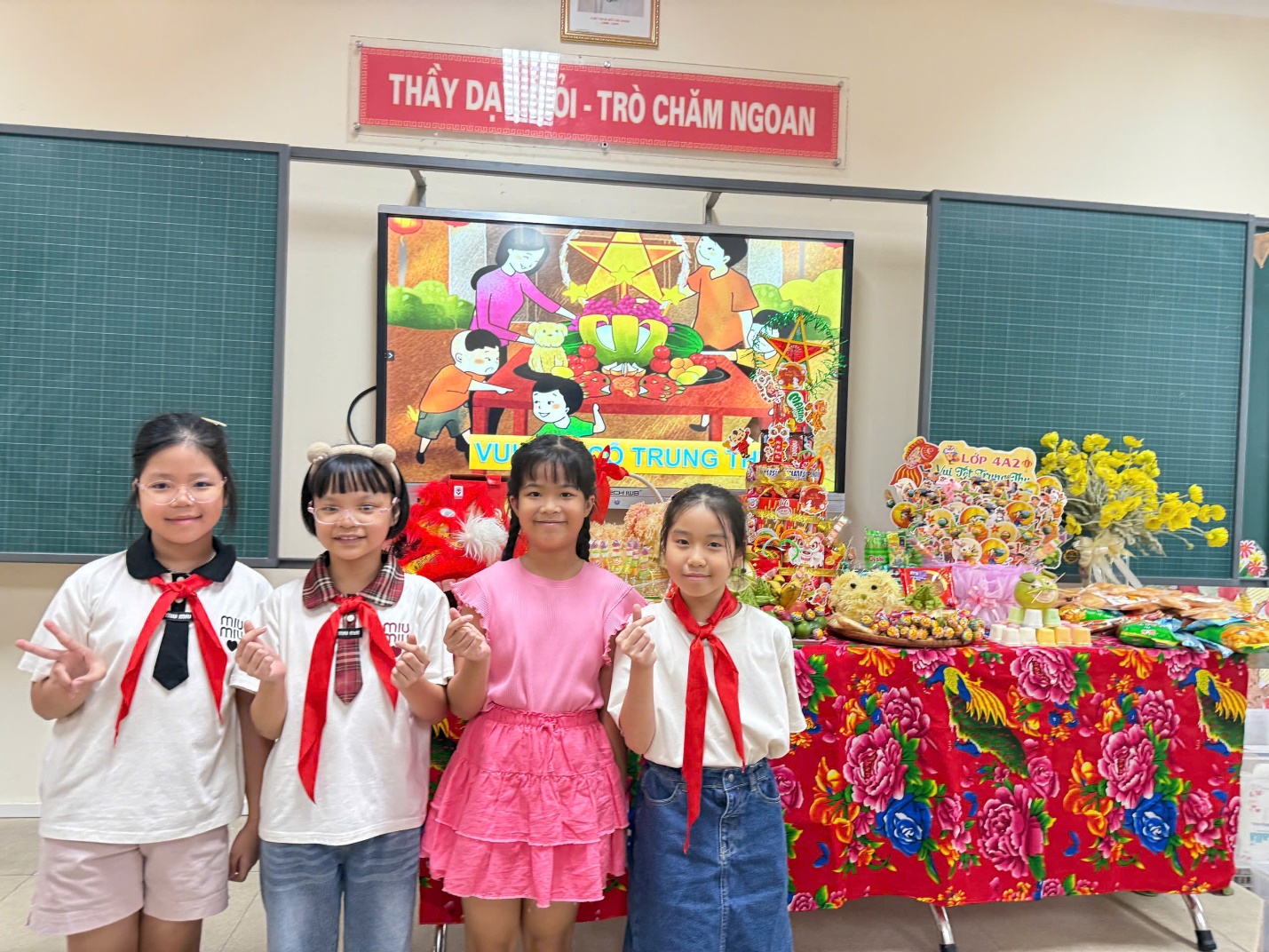 Ngay từ những ngày đầu tuần, các lớp trong khối 4 đã rộn ràng chuẩn bị cho ngày hội. Dưới sự hướng dẫn tận tình của thầy cô và sự đồng hành của cha mẹ, các em nhỏ khéo léo trang trí lớp học, sáng tạo nên những mâm cỗ Trung thu đầy sắc màu. Từ những trái bưởi, quả chuối, bánh kẹo bình dị, qua đôi tay khéo léo của các em đã biến thành những chú thỏ ngộ nghĩnh, con cá chép, con công rực rỡ… Mỗi mâm cỗ là một “bức tranh” nhỏ, thể hiện tình yêu, sự khéo léo và trí tưởng tượng phong phú của học trò.