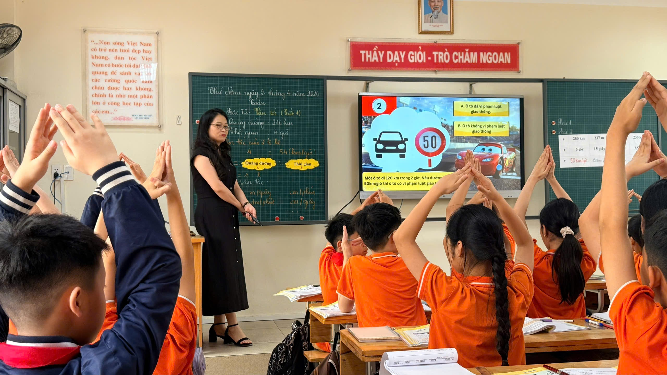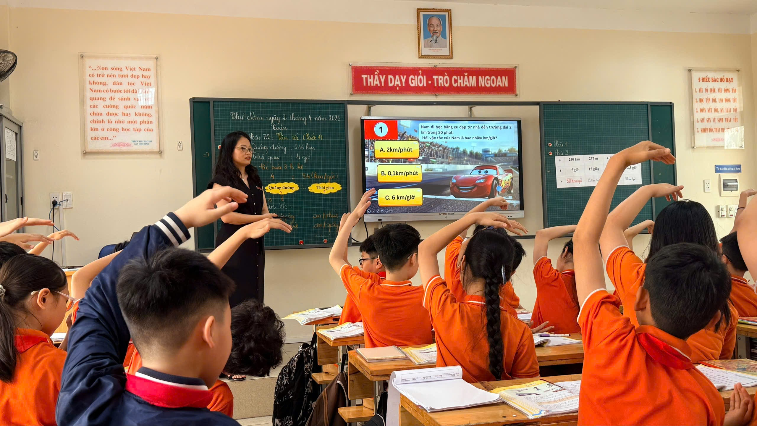 Ngay từ phần khởi động, cô giáo Đỗ Thị Huệ đã khéo léo dẫn dắt học sinh vào bài học bằng những tình huống gần gũi, gắn liền với thực tế đời sống như các phương tiện giao thông, quãng đường di chuyển hằng ngày. Cách vào bài nhẹ nhàng, sinh động đã nhanh chóng thu hút sự chú ý và khơi dậy sự tò mò, ham học hỏi của các em.