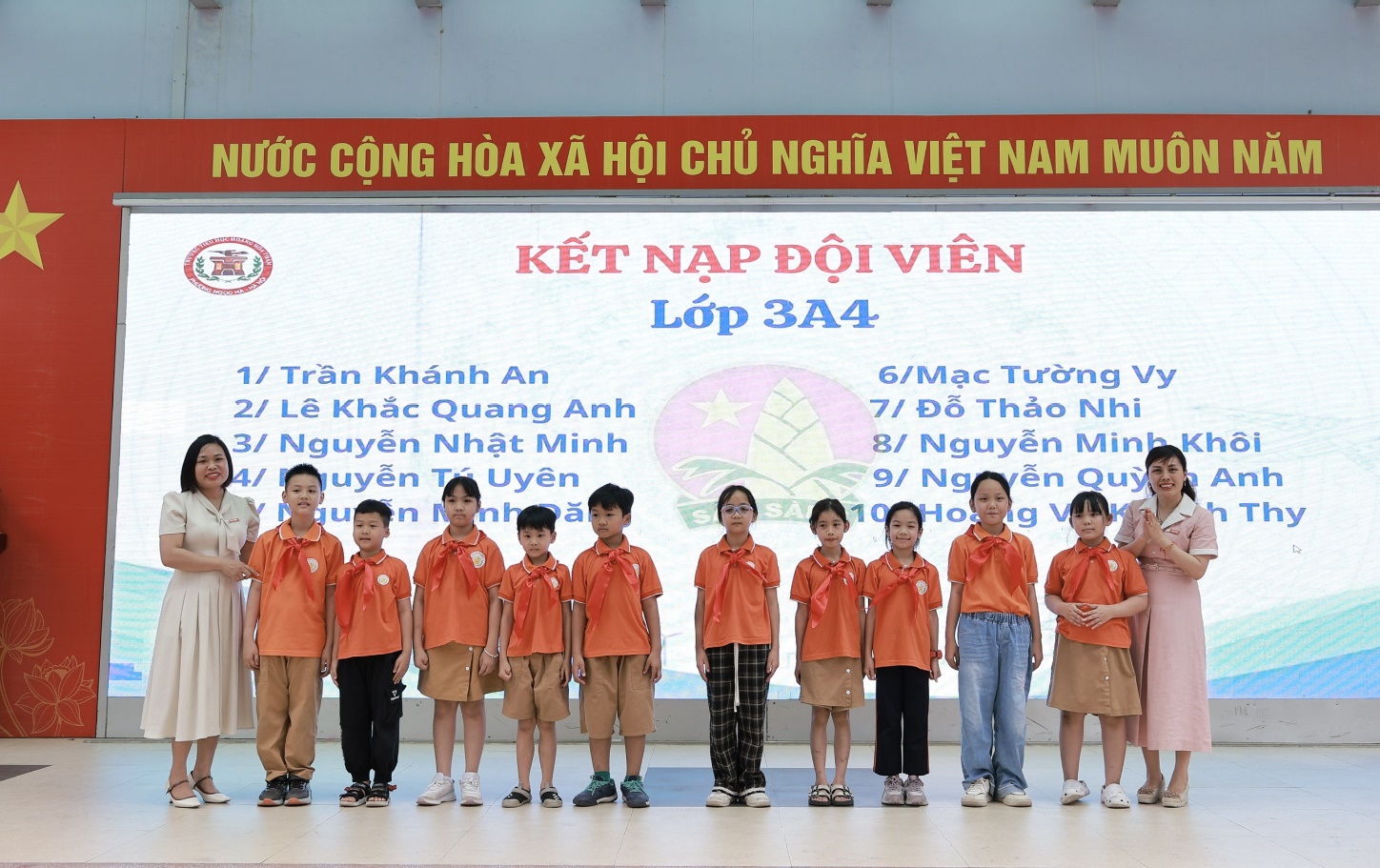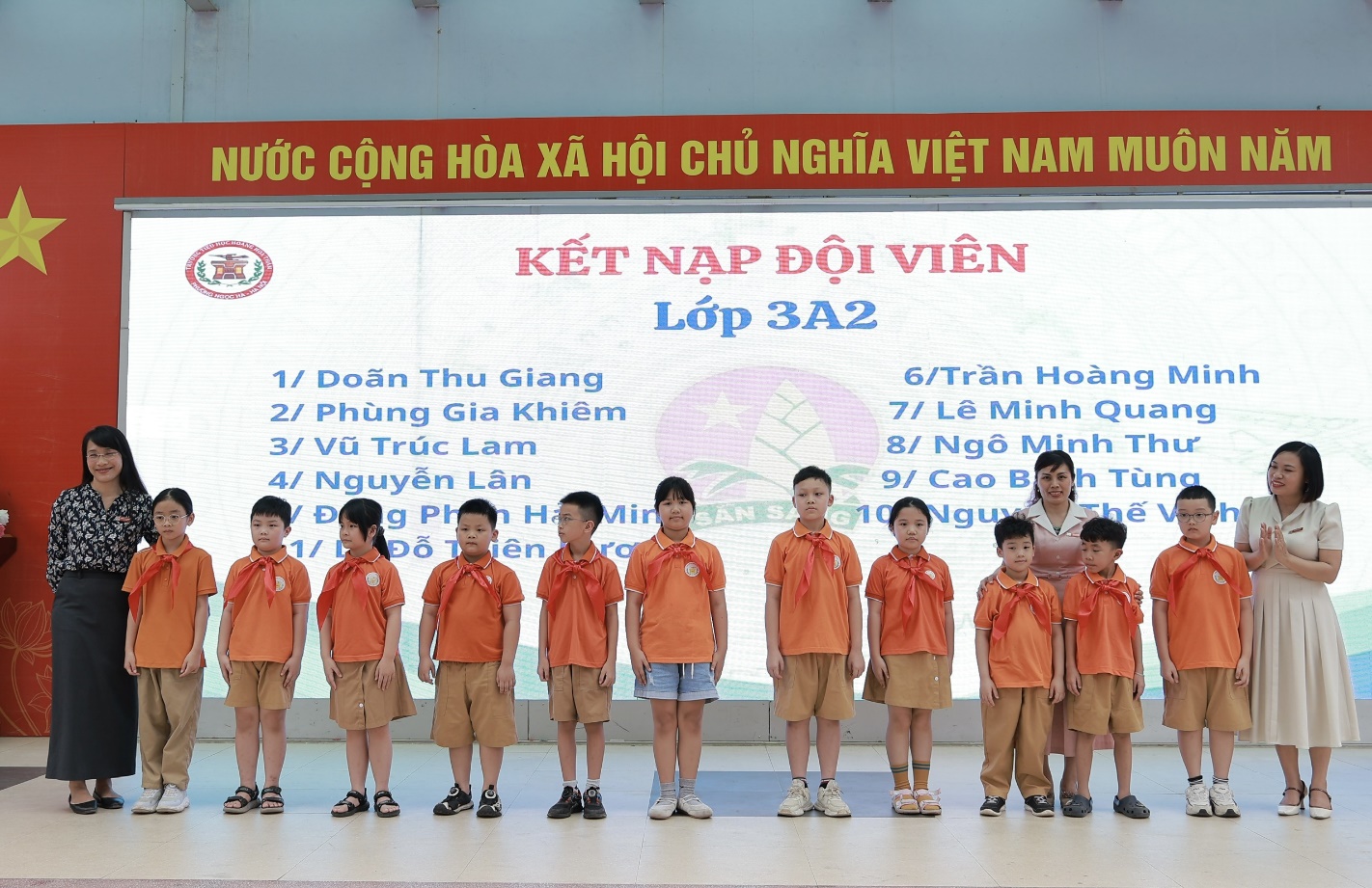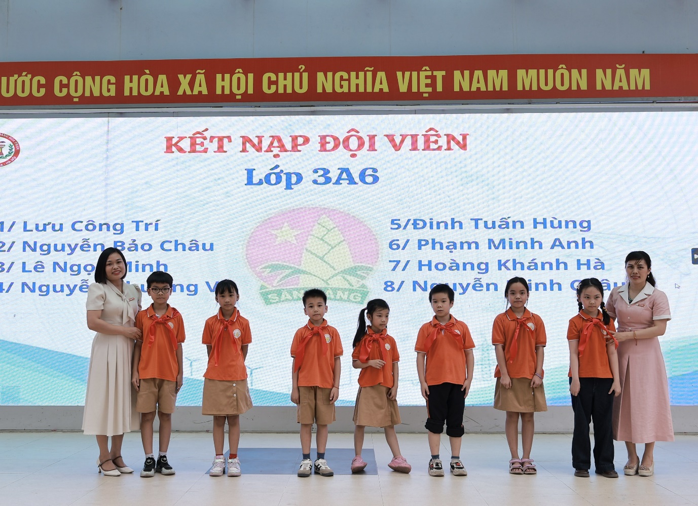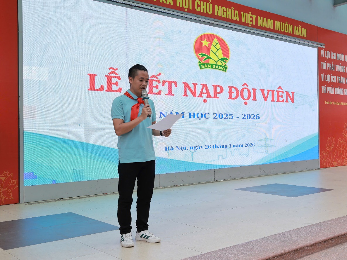 Trong phần trọng tâm, các em học sinh ưu tú của từng lớp lần lượt được gọi tên lên sân khấu để thực hiện nghi thức kết nạp Đội. Dưới sự chứng kiến của toàn thể đại biểu, thầy Tổng phụ trách cùng Ban Giám hiệu nhà trường đã trực tiếp đeo khăn quàng đỏ cho các em. Chiếc khăn quàng đỏ – biểu tượng thiêng liêng của Đội – đã trở thành niềm tự hào, đánh dấu bước trưởng thành của mỗi học sinh.