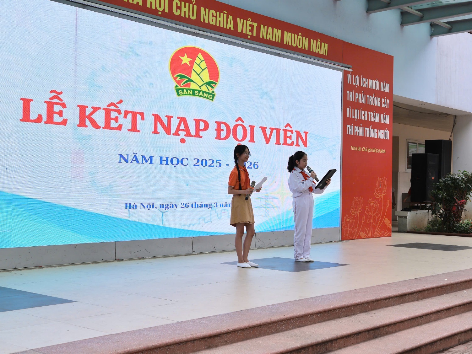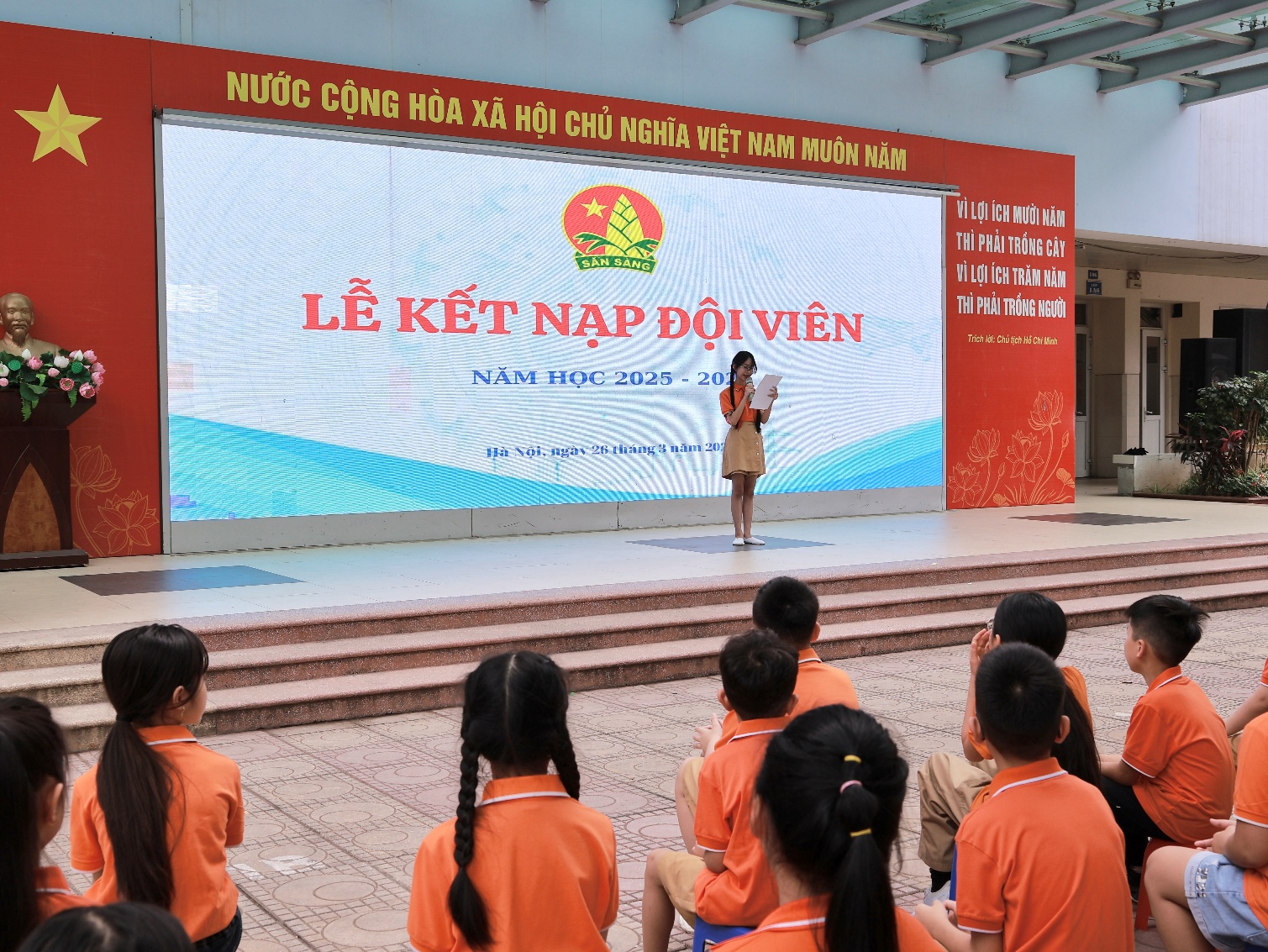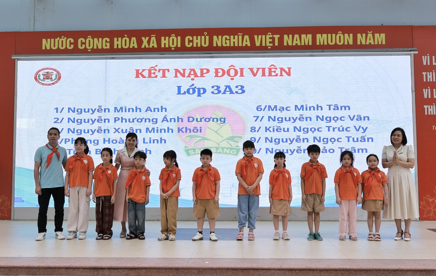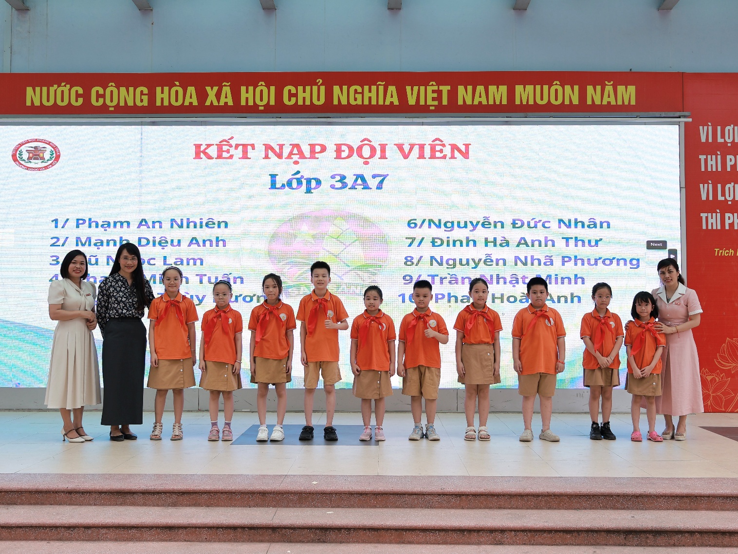 Trong phần trọng tâm, các em học sinh ưu tú của từng lớp lần lượt được gọi tên lên sân khấu để thực hiện nghi thức kết nạp Đội. Dưới sự chứng kiến của toàn thể đại biểu, thầy Tổng phụ trách cùng Ban Giám hiệu nhà trường đã trực tiếp đeo khăn quàng đỏ cho các em. Chiếc khăn quàng đỏ – biểu tượng thiêng liêng của Đội – đã trở thành niềm tự hào, đánh dấu bước trưởng thành của mỗi học sinh.