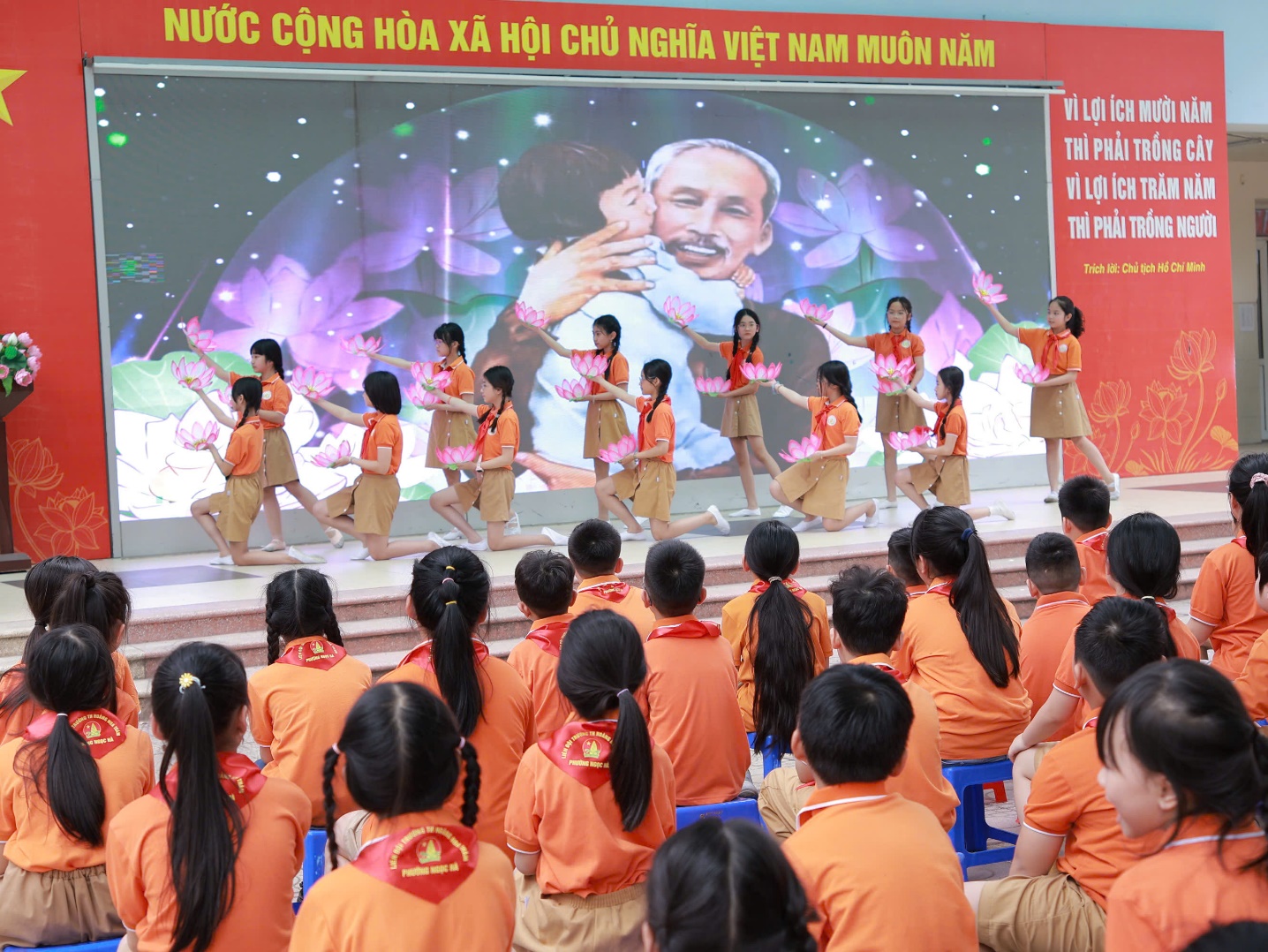 Buổi lễ càng trở nên ý nghĩa hơn với nghi thức dâng hoa lên Bác Hồ kính yêu, thể hiện sự tri ân sâu sắc của thầy và trò nhà trường đối với vị lãnh tụ vĩ đại.