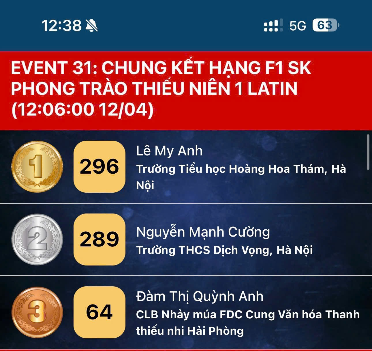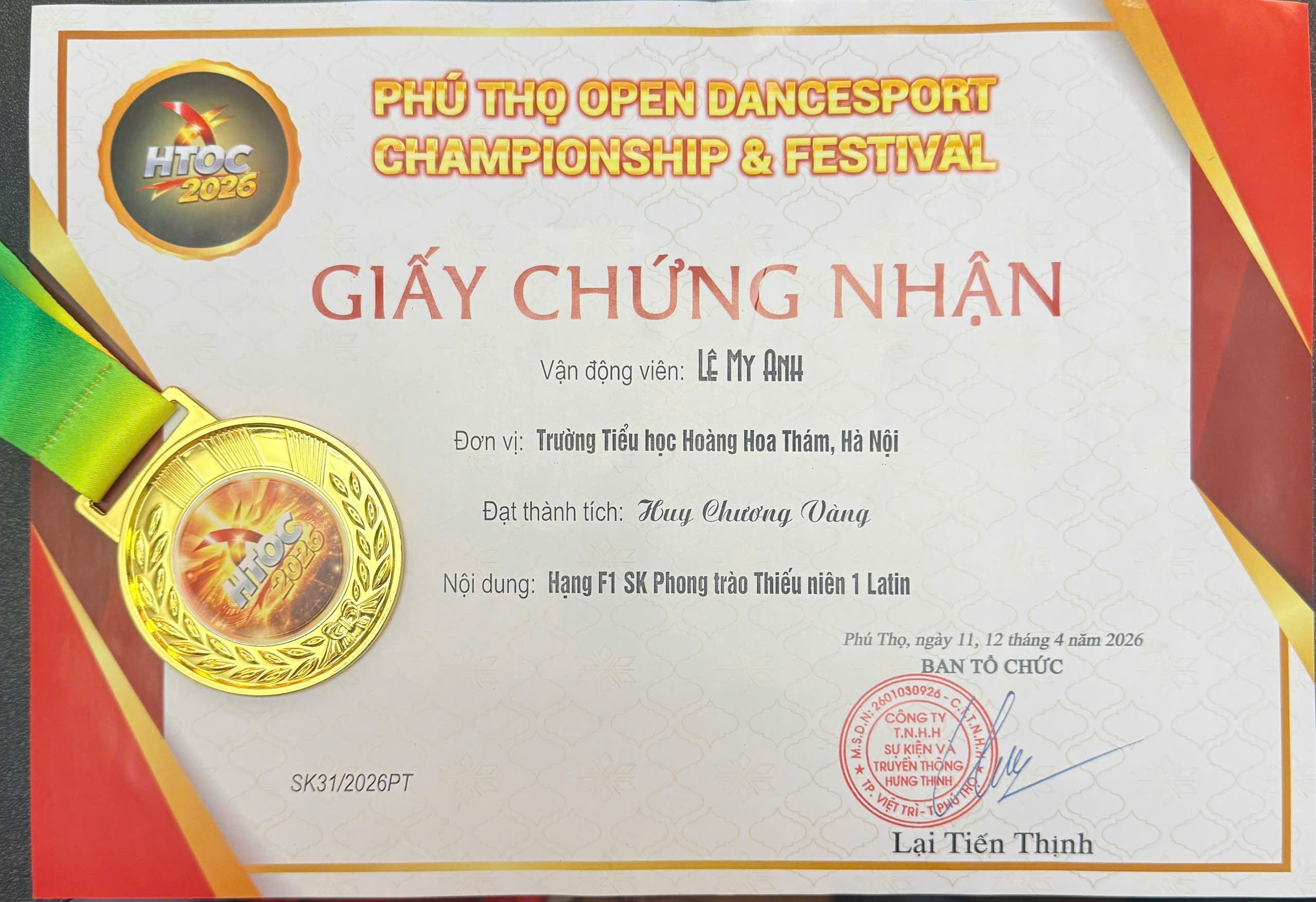 My Anh đạt Huy chương Vàng trong trận Chung kết Hạng F1 SK hong trào Thiếu niên 1 Latin ngày 12/4/2026