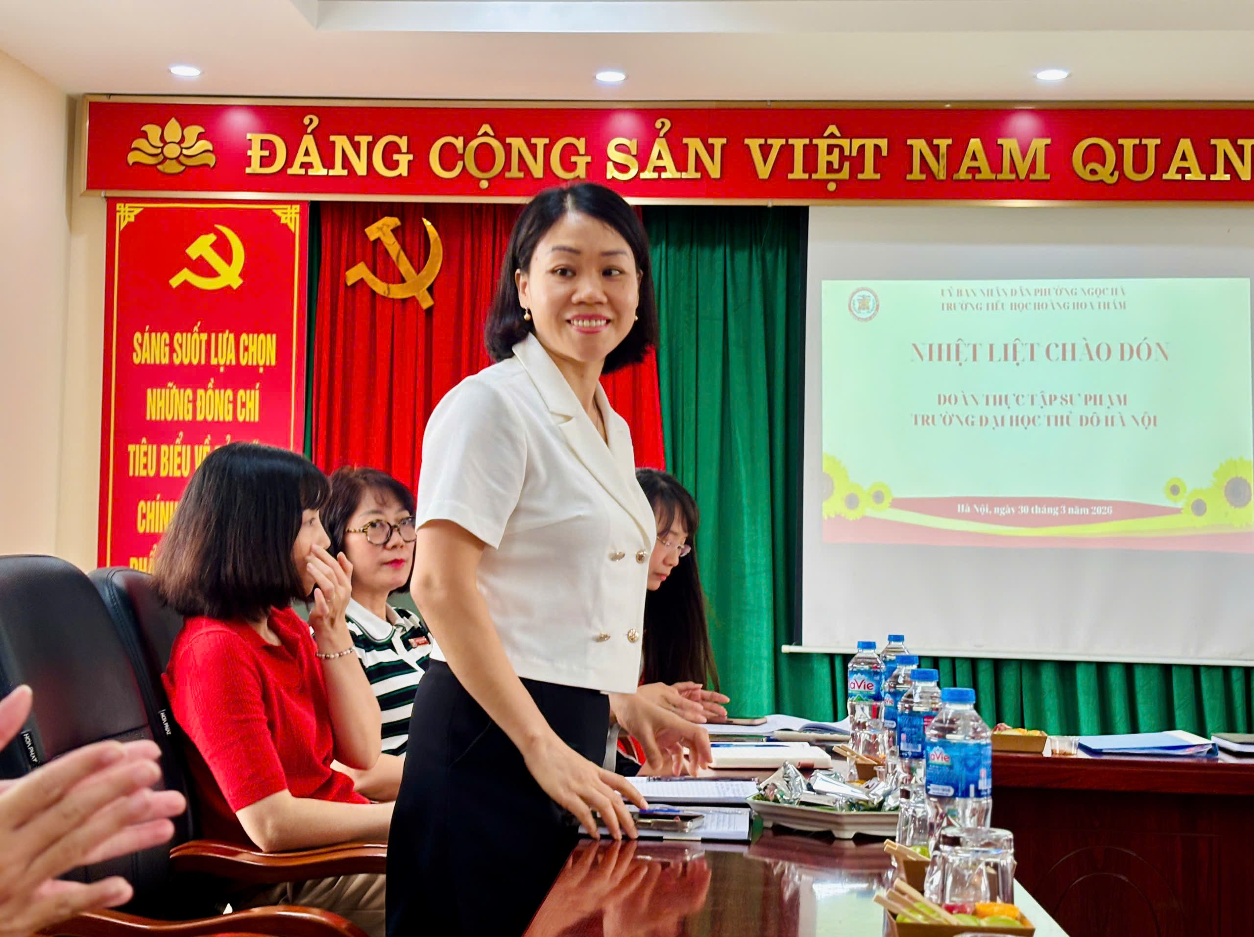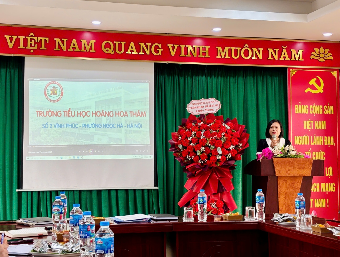 Phát biểu tại buổi ra mắt, đại diện Ban Giám hiệu trường Tiểu học Hoàng Hoa Thám, cô Nguyễn Thị Mai Hương, Bí thư chi bộ, Hiệu trưởng nhà trường, đã gửi lời chào mừng nồng nhiệt tới đoàn giáo sinh thực tập. Đồng thời, đoàn giáo sinh cũng được giới thiệu khái quát về truyền thống, quy mô, cũng như những thành tích nổi bật của nhà trường trong thời gian qua thông qua 2 báo cáo của cô Trần Thị Hồng Ngọc, Phó Bí thư chi bộ, Phó hiệu trưởng và thầy Phạm Ngọc Tú, Tổng phụ trách nhà trường. Ban Giám hiệu cũng nhấn mạnh, hoạt động thực tập sư phạm là cơ hội quý báu để sinh viên vận dụng kiến thức đã học vào thực tế giảng dạy, rèn luyện kỹ năng tổ chức lớp học, quản lý học sinh và tham gia các hoạt động giáo dục toàn diện.