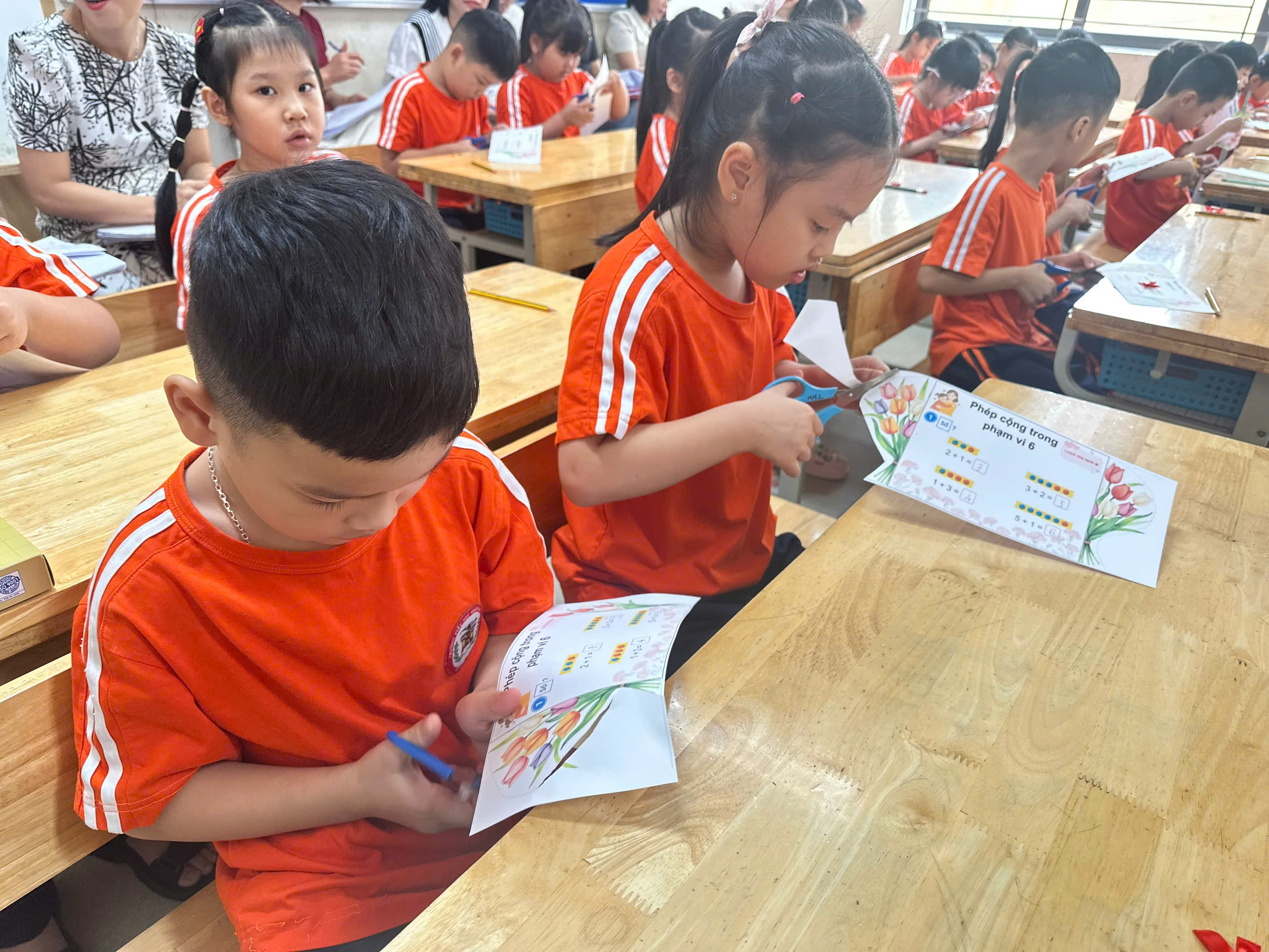 Học sinh sử dụng phiếu để hoàn thành đơn vị kiến thức về các phép cộng trong phạm vi 6. Và chính từ chiếc phiếu đó, những bó hoa xinh tươi nhiều màu sắc được hình thành. Qua đó, các em vừa củng cố kiến thức, vừa rèn luyện kỹ năng tư duy, hợp tác nhóm và sáng tạo trong thực hành.