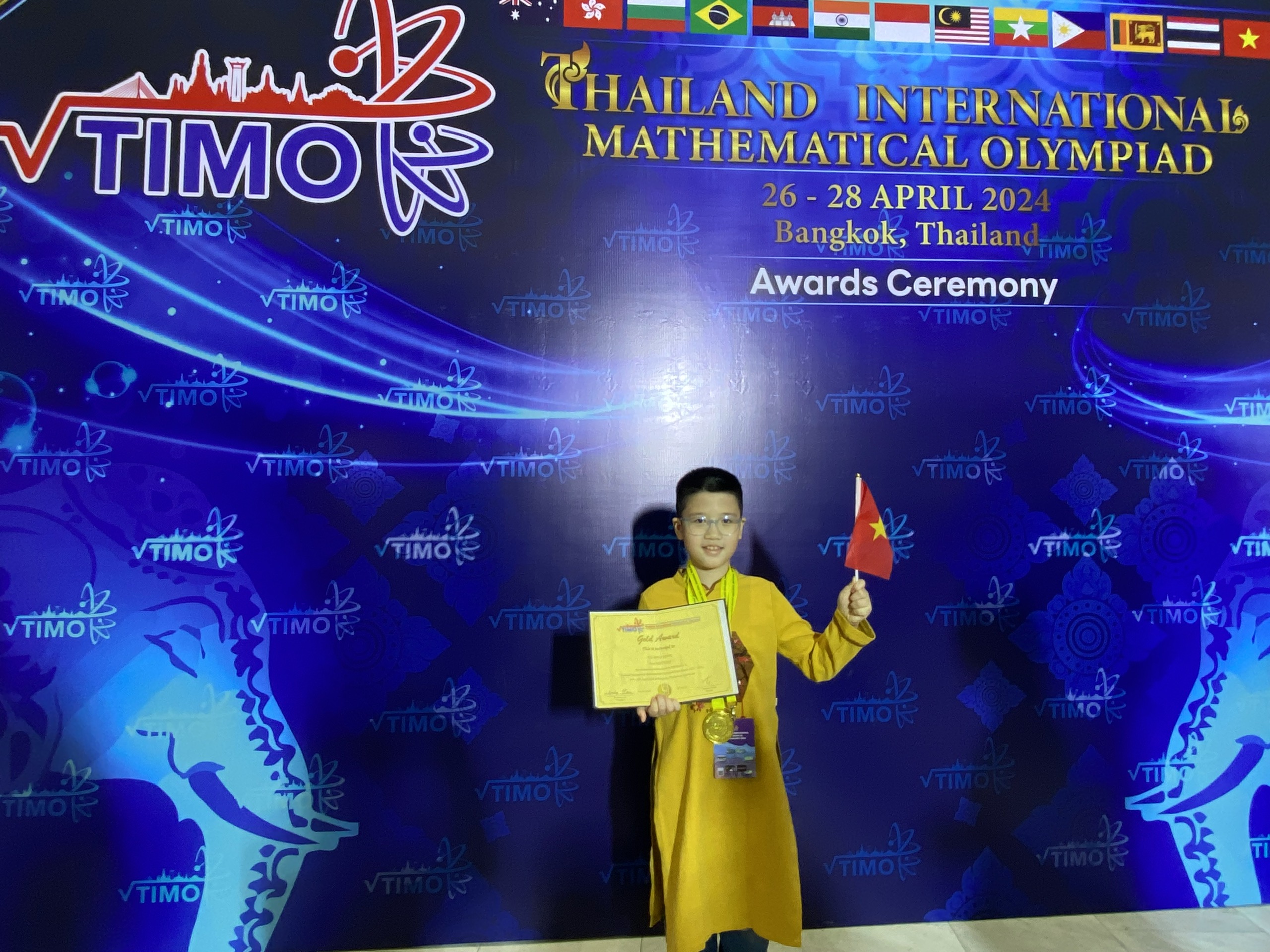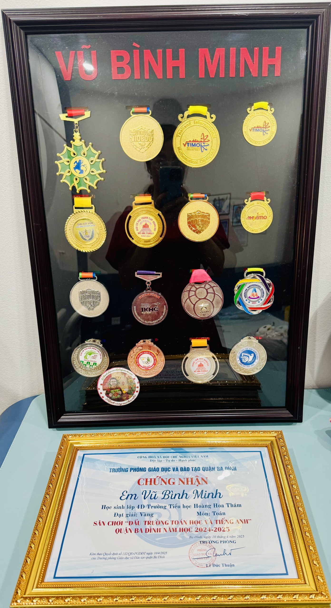 Không chỉ tỏa sáng ở các sân chơi trong nước, năm 2024, em Vũ Bình Minh đã xuất sắc giành Huy chương Vàng tại kỳ thi TIMO – Thailand International Mathematical Olympiad Final Round tổ chức tại Bangkok (Thái Lan). Đây là dấu ấn đáng tự hào, góp phần khẳng định năng lực hội nhập quốc tế cũng như bản lĩnh thi đấu của học sinh Trường Tiểu học Hoàng Hoa Thám trên các đấu trường trí tuệ. Bên cạnh đó, em còn đạt nhiều thành tích ấn tượng khác như: 1 Huy chương Vàng ASMO, 2 Huy chương Vàng VioEdu, 1 Huy chương Bạc VioEdu…