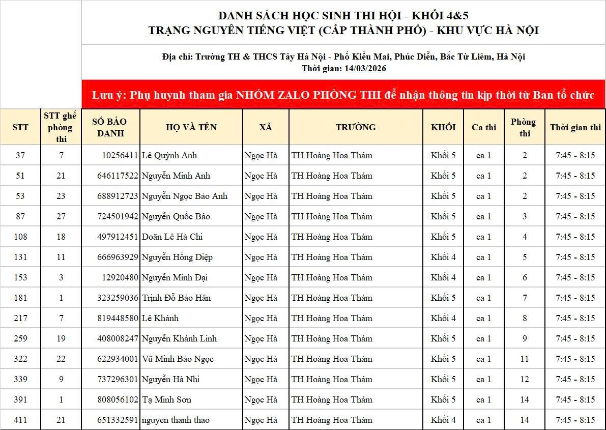 Ban tổ chức sân chơi "Trạng nguyên Tiếng Việt" và Trường Tiểu học Hoàng Hoa Thám trân trọng thông báo Danh sách học sinh khối 4, 5 được tham gia thi Hội "Trạng nguyên Tiếng Việt" cấp Thành phố khối khu vực Hà Nội năm học 2025- 2026: