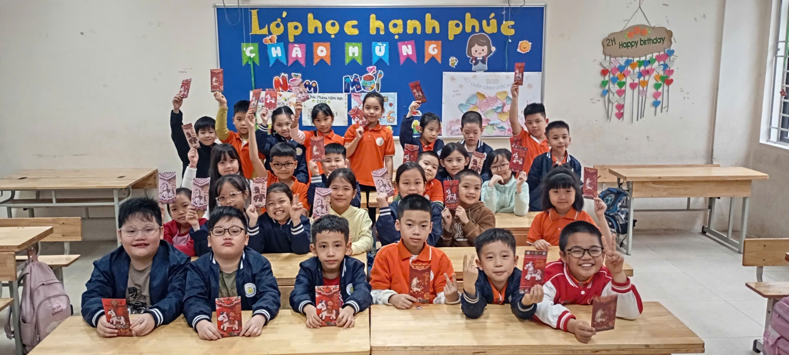 Mỗi bạn nhỏ lớp 3 khi bước chân vào lớp sẽ được "hái lộc" may mắn của các cô giáo. Những phong bao lì xì nhỏ xinh mang theo hy vọng các con sẽ luôn chăm ngoan, học giỏi và đạt thật nhiều điểm 10 trong năm mới.