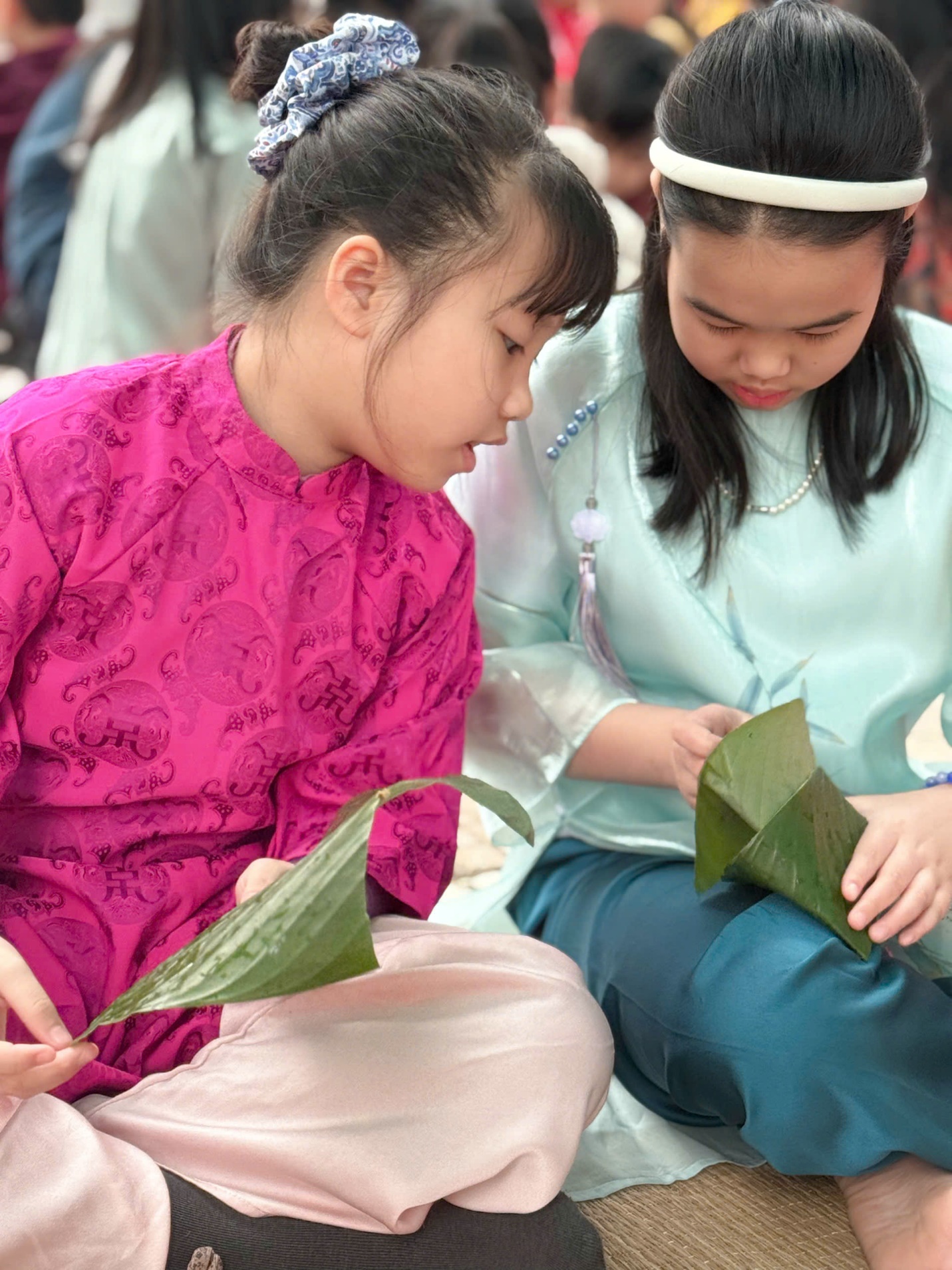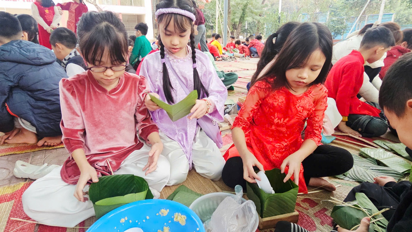 Điểm nhấn của ngày hội chính là hoạt động trải nghiệm gói bánh chưng. Dưới sự hướng dẫn tận tình của thầy cô và phụ huynh, các em học sinh khối 4 được trực tiếp tham gia từng công đoạn: xếp đỗ xanh, thịt, gấp lá và buộc lạt. Những đôi tay nhỏ nhắn thoăn thoắt, những ánh mắt háo hức, say mê đã tạo nên một khung cảnh vô cùng ấm áp. Tự tay gói cho mình chiếc bánh chưng xanh không chỉ là trải nghiệm thú vị mà còn giúp các em thêm trân trọng giá trị lao động và nét đẹp truyền thống ngày Tết.