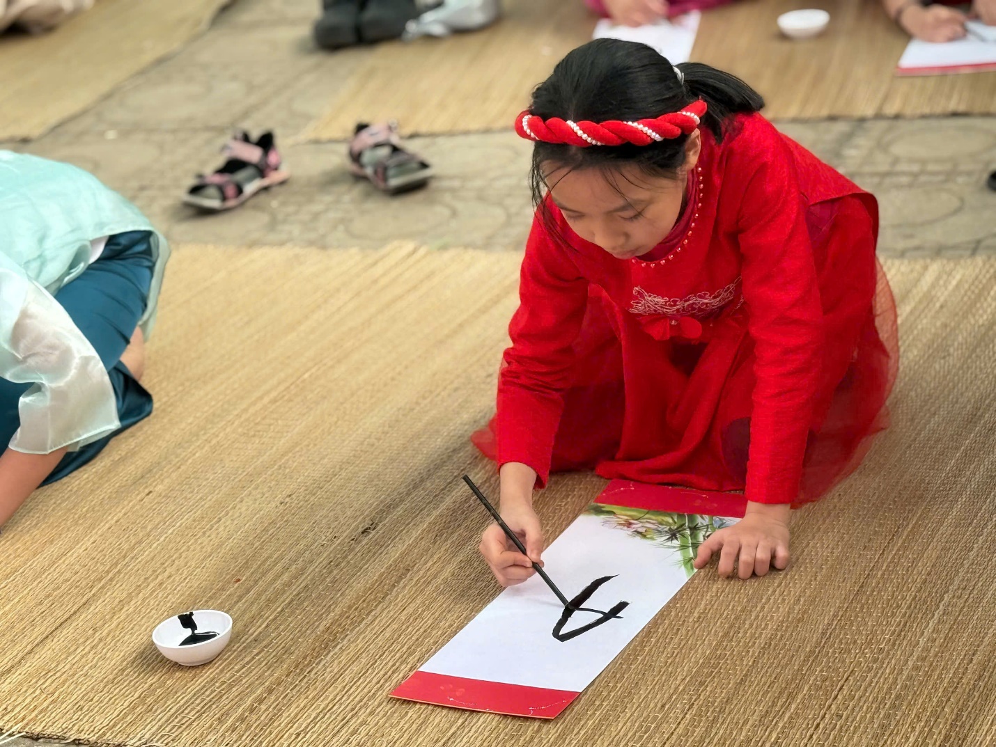 Bên cạnh hoạt động gói bánh, học sinh khối 4 còn được tham gia nhiều trò chơi và trải nghiệm hấp dẫn. Đặc biệt, phần thi viết chữ thư pháp đã trở thành điểm nhấn riêng của khối. Trong không gian đậm sắc xuân, các “ông đồ nhí” chăm chú nắn nót từng nét bút, viết nên những chữ mang ý nghĩa tốt đẹp như An,… Hoạt động không chỉ rèn luyện sự kiên trì, khéo léo mà còn giúp các em hiểu thêm về nghệ thuật thư pháp – một nét đẹp văn hóa truyền thống mỗi dịp Tết đến xuân về. Sân trường vì thế càng thêm trang trọng, nên thơ với những tờ giấy đỏ thắm và mùi mực tàu thoang thoảng.