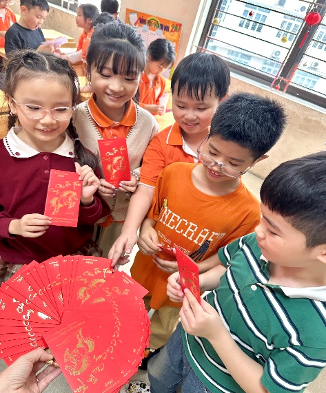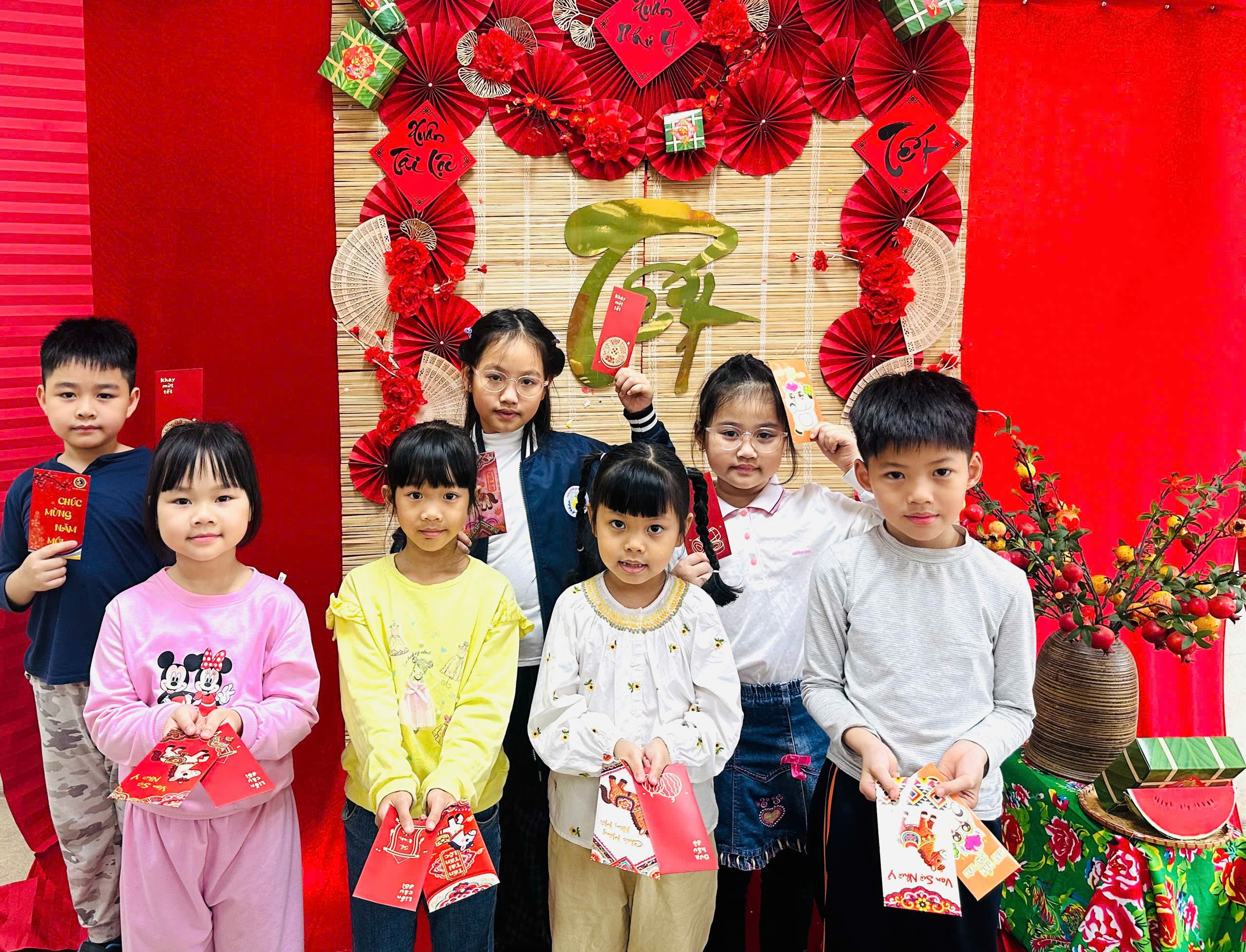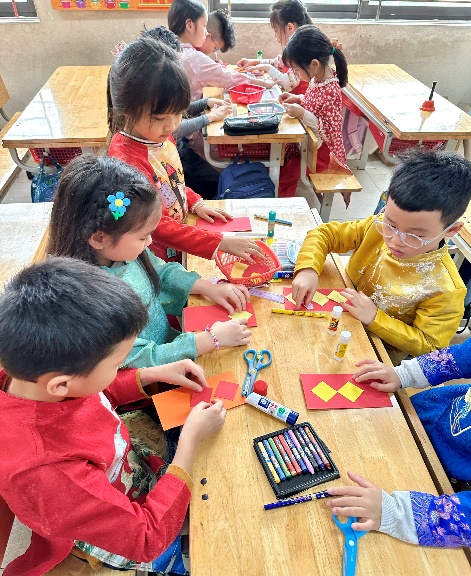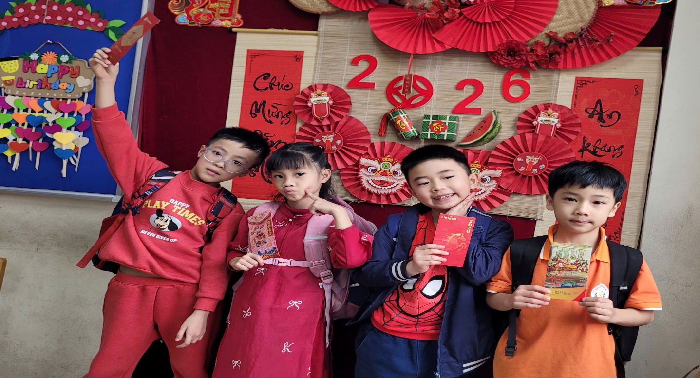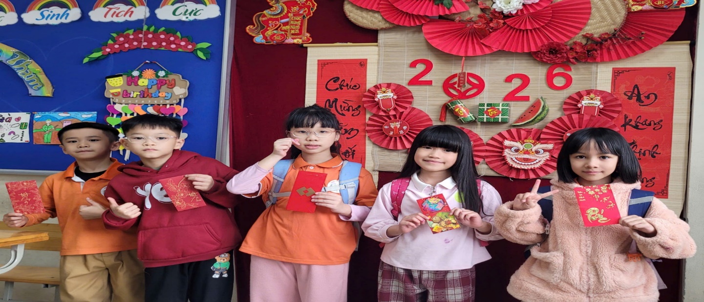 Ngay tại lớp học, các em hào hứng tham gia trò chơi liên quan đến Tết Nguyên đán như tìm hiểu phong tục, tập quán và ý nghĩa truyền thống của ngày Tết. Các câu hỏi xoay quanh phong tục, truyền thống và những giá trị tốt đẹp của Tết cổ truyền dân tộc Việt Nam giúp học sinh vừa ôn lại kiến thức, vừa hiểu thêm về nét đẹp văn hóa dân tộc. Mỗi câu trả lời đúng không chỉ mang lại bao lì xì may mắn mà còn là sự động viên tinh thần, khích lệ các em sẵn sàng cho hành trình học tập của năm mới. Những học sinh trả lời đúng nhận được bao lì xì may mắn cùng lời chúc đầu năm từ thầy cô và bạn bè. Đặc biệt, toàn thể các bạn học sinh của khối lớp 2 lớp đều được mừng tuổi trong ngày học đầu tiên của năm mới.