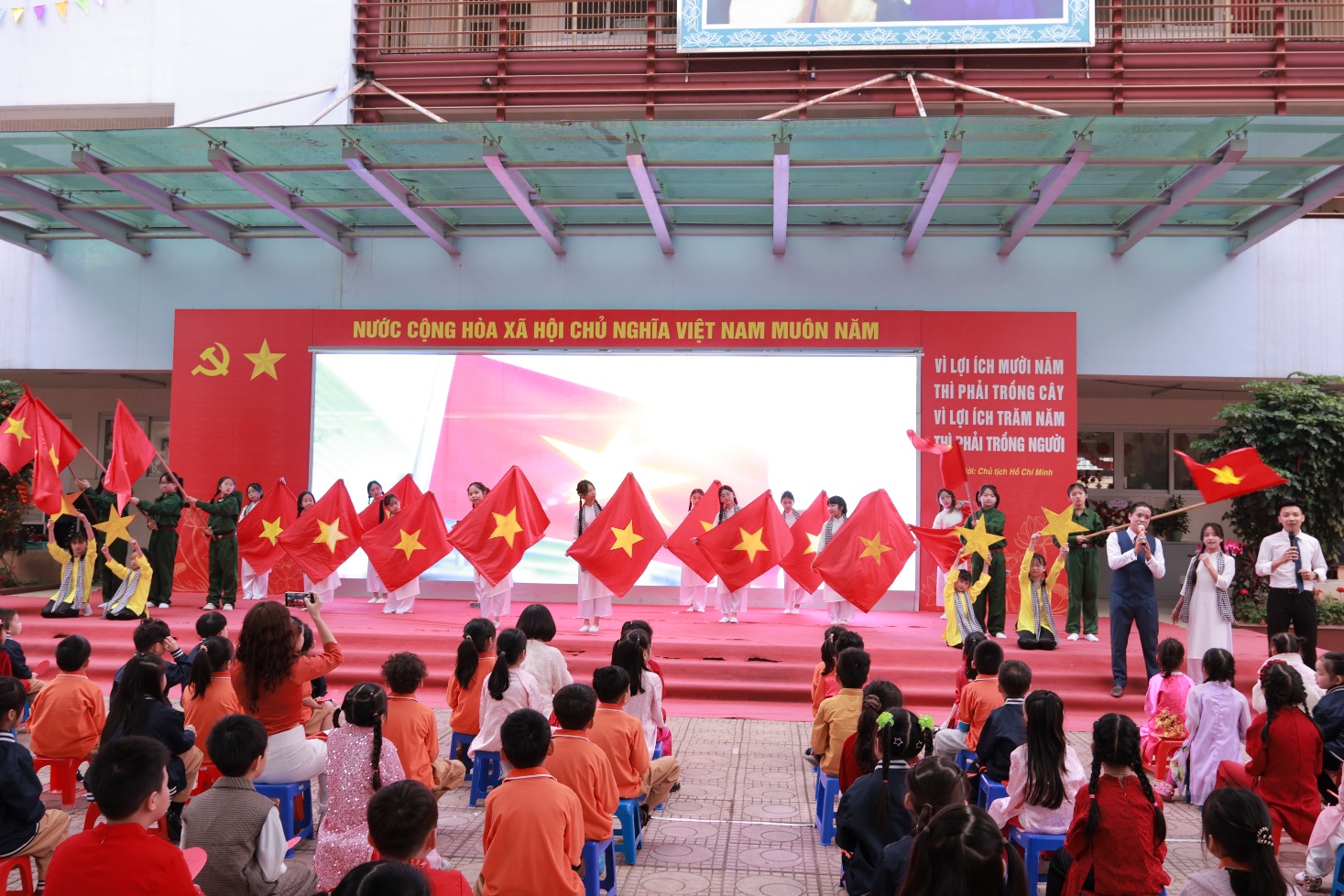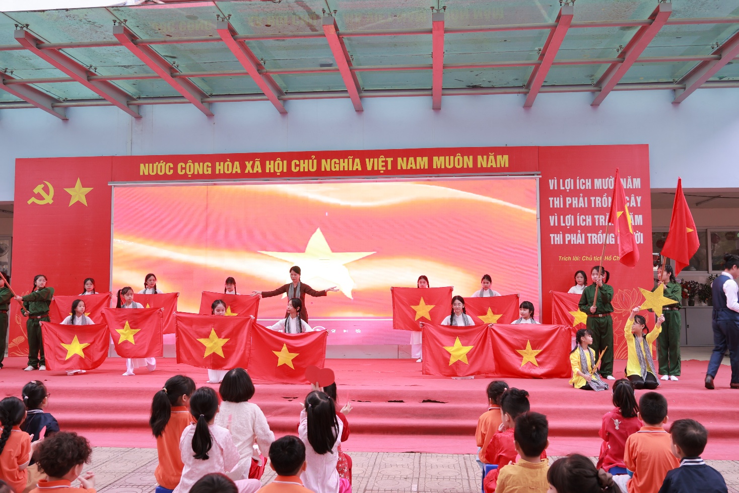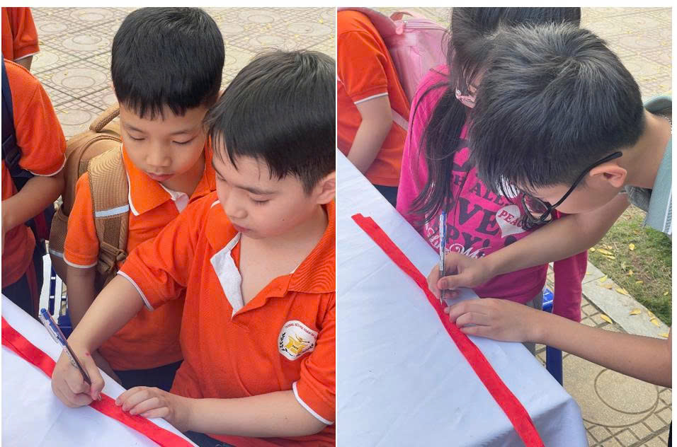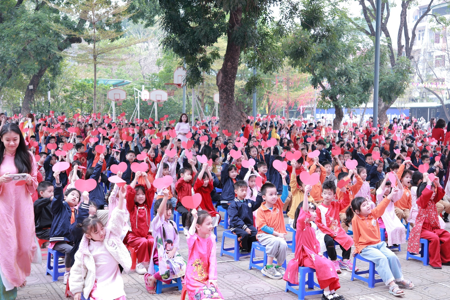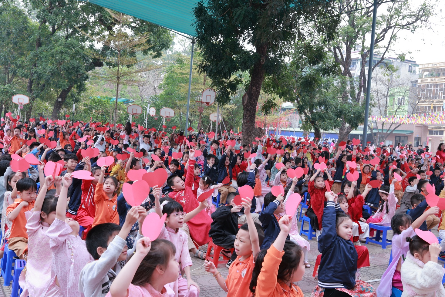 Tiếp theo chương trình là hoạt động đầy cảm xúc mang tên “Ngàn trái tim yêu thương”. Hơn một nghìn học sinh của nhà trường đã cùng nhau giơ cao những trái tim màu đỏ, trên đó ghi những lời chúc chân thành gửi tới bà, mẹ và cô giáo - những người phụ nữ thân yêu trong cuộc sống của các em. Những lời chúc giản dị nhưng chứa đựng biết bao tình cảm: lời cảm ơn bà đã chăm sóc, lời chúc mẹ luôn mạnh khỏe, hay những lời tri ân dành cho cô giáo tận tụy. Cả sân trường như vỡ òa khi các em đồng thanh hô vang những lời chúc tốt đẹp nhất dành cho bà, cho mẹ, cho cô, tạo nên một khoảnh khắc ấm áp và đầy ý nghĩa.