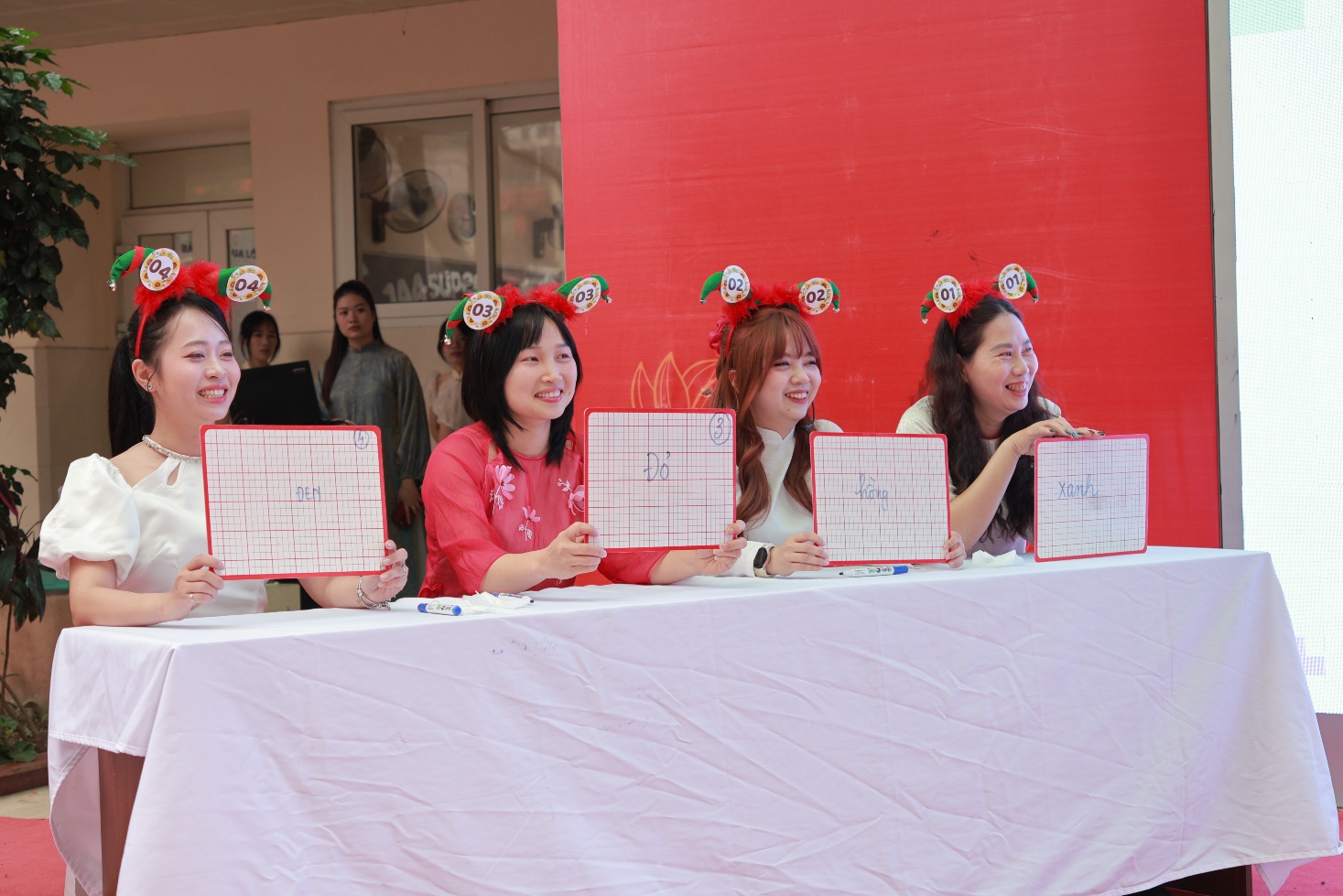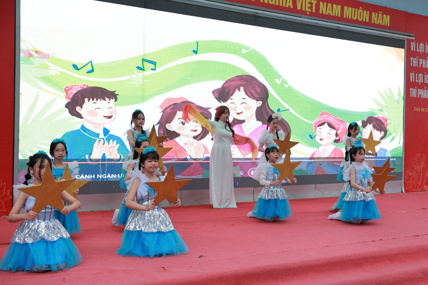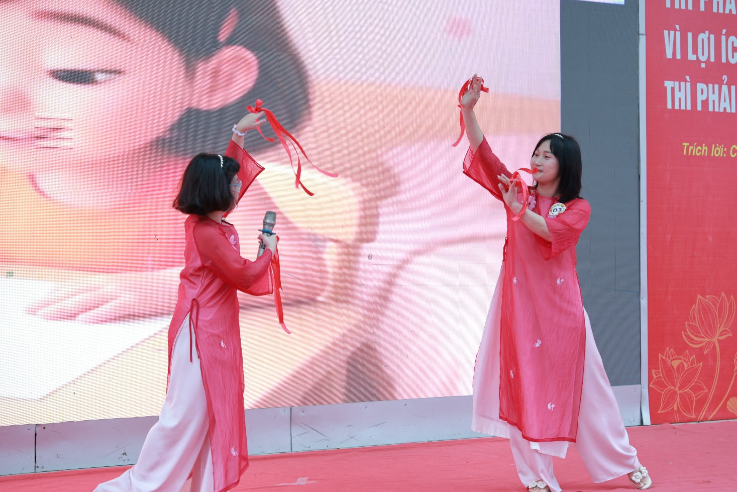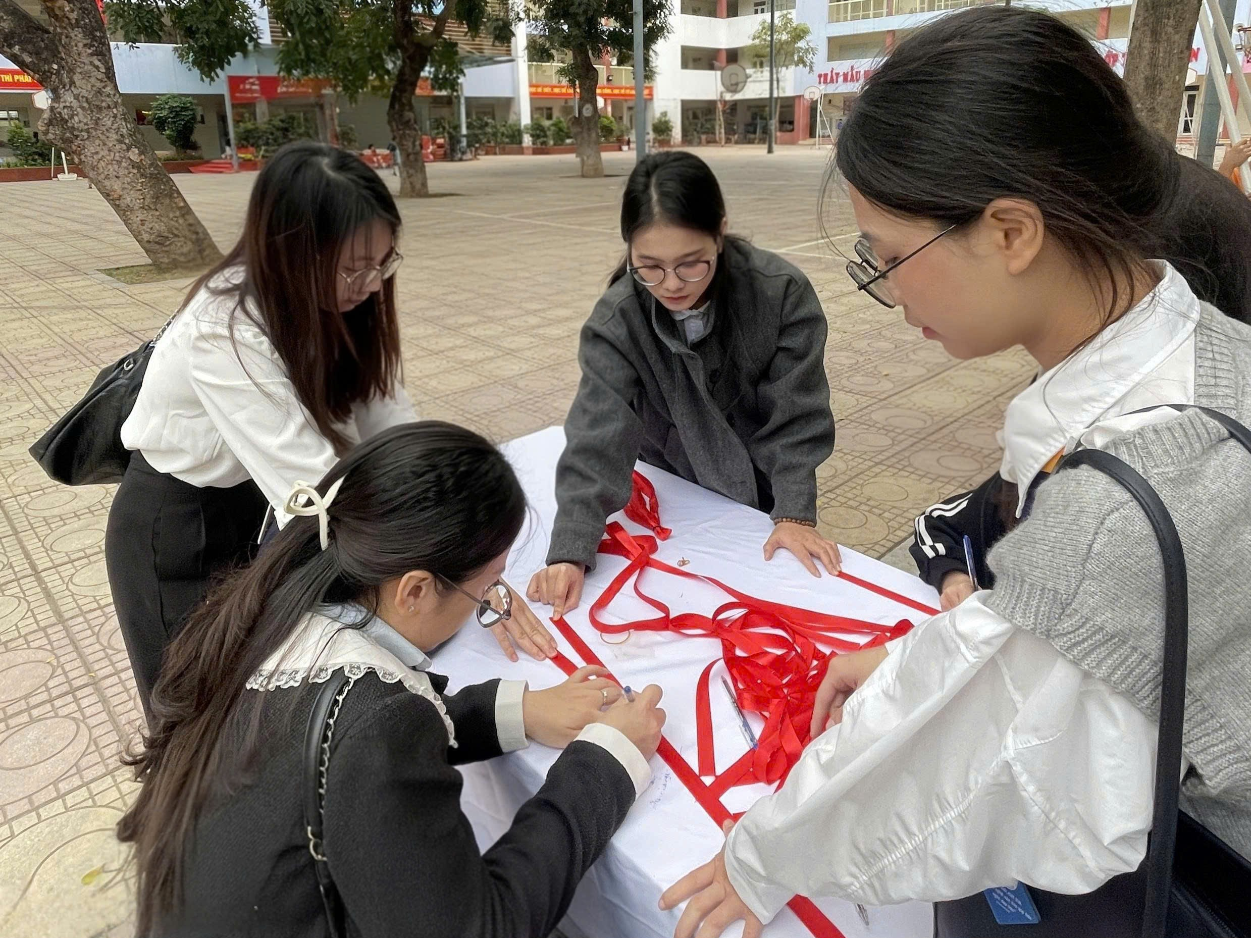 Tiếp theo chương trình là hoạt động đầy cảm xúc mang tên “Ngàn trái tim yêu thương”. Hơn một nghìn học sinh của nhà trường đã cùng nhau giơ cao những trái tim màu đỏ, trên đó ghi những lời chúc chân thành gửi tới bà, mẹ và cô giáo - những người phụ nữ thân yêu trong cuộc sống của các em. Những lời chúc giản dị nhưng chứa đựng biết bao tình cảm: lời cảm ơn bà đã chăm sóc, lời chúc mẹ luôn mạnh khỏe, hay những lời tri ân dành cho cô giáo tận tụy. Cả sân trường như vỡ òa khi các em đồng thanh hô vang những lời chúc tốt đẹp nhất dành cho bà, cho mẹ, cho cô, tạo nên một khoảnh khắc ấm áp và đầy ý nghĩa.
