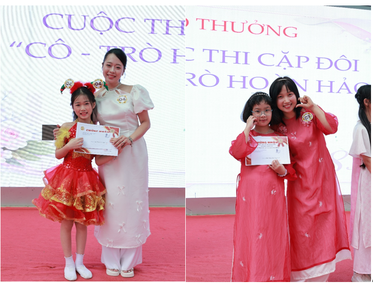 Ngay sau các tiết mục văn nghệ mở màn là cuộc thi “Cô - trò Cặp đôi hoàn hảo” với sự tham gia của 4 cặp đôi giáo viên - học sinh đến từ khối lớp 4 và lớp 5. Trên sân khấu của nhà trường, các cặp đôi đã mang đến những phần trình diễn tự tin, sáng tạo và đầy gắn kết. Từ các phần thể hiện sự hiểu ý giữa cô và trò đến những tiết mục văn nghệ duyên dáng, tài năng, mỗi phần thi đều nhận được sự cổ vũ nhiệt tình của toàn thể học sinh và giáo viên. Cuộc thi không chỉ tạo nên bầu không khí vui tươi mà còn thể hiện tình cảm thân thiết, sự đồng hành giữa thầy cô và học sinh trong quá trình học tập và rèn luyện.