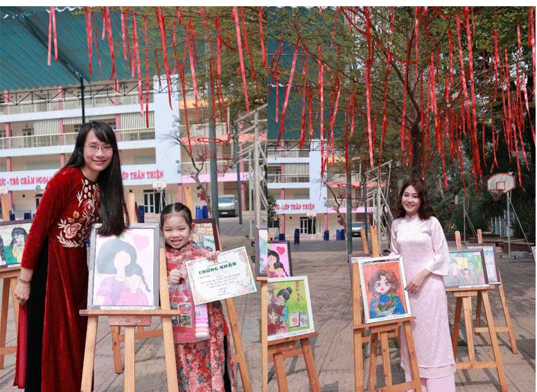 Ngay từ cổng trường, khu vực "Cây Hạnh Phúc" đã trở thành tâm điểm thu hút mọi ánh nhìn. Bao quanh gốc cây là không gian triển lãm đầy màu sắc với những tác phẩm đạt giải từ cuộc thi "Vẽ người phụ nữ em yêu". Những nét vẽ ngây thơ khắc họa chân dung mẹ, bà và cô giáo không chỉ tô điểm cho cảnh quan sân trường mà còn là lời bày tỏ tình cảm chân thành nhất của các con dành cho một nửa thế giới.