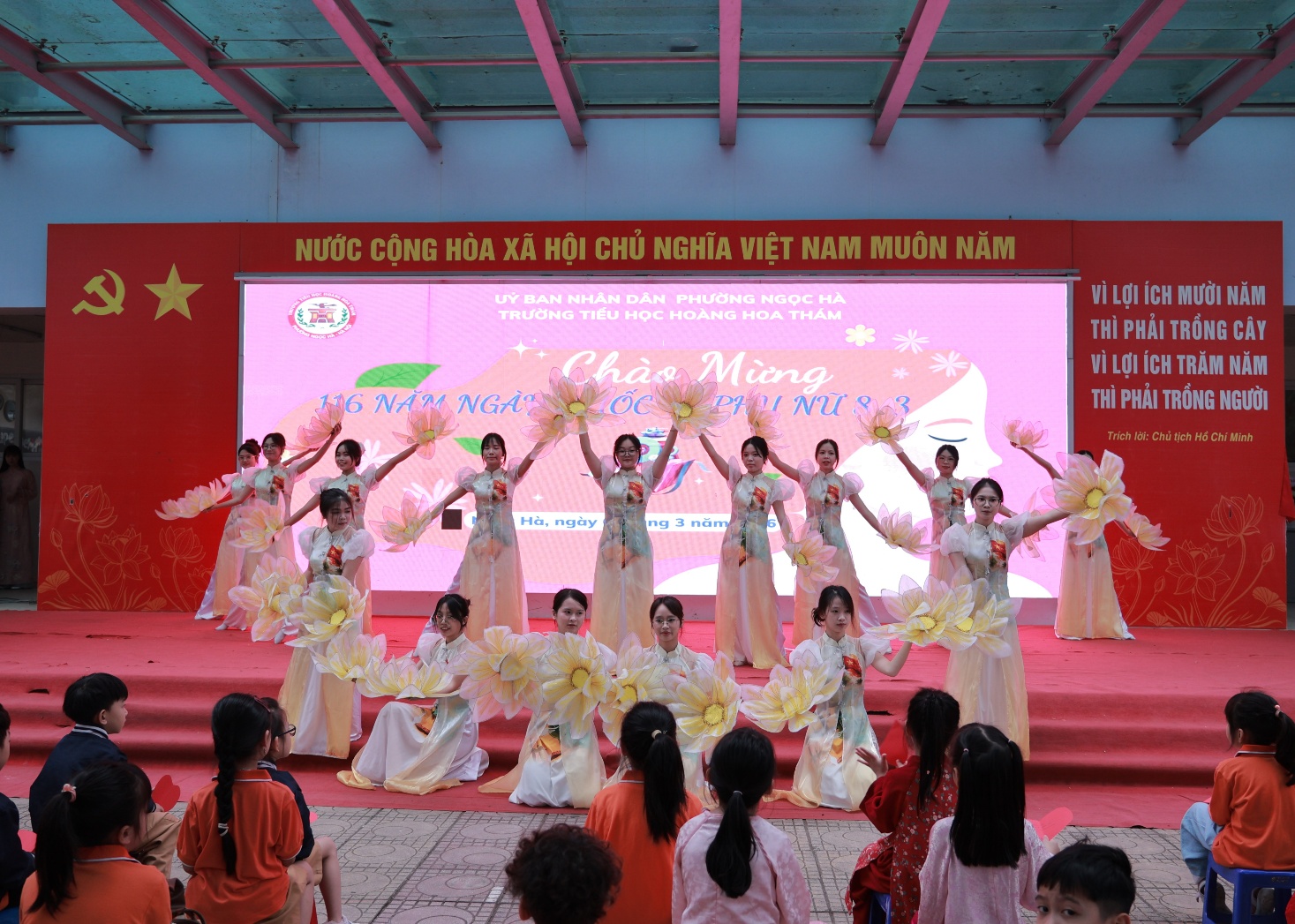 Mở đầu chương trình sinh hoạt tập thể là các tiết mục văn nghệ đặc sắc của thầy trò trường Tiểu học Hoàng Hoa Thám và các giáo sinh trường Đại học Thủ đô đang thực tập tại trường. Các tiết mục là những tình cảm, những lời tri ân đến những người phụ nữ yêu thương.