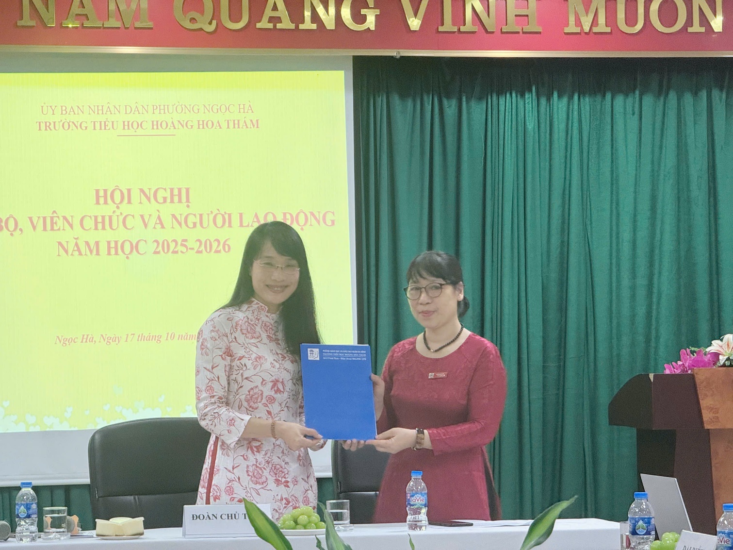 Trong bầu không khí trang trọng và đầy khí thế, Ban Giám hiệu cùng Ban Chấp hành Công đoàn nhà trường đã long trọng ký kết Giao ước thi đua năm học 2025 – 2026. Bản giao ước là minh chứng cho tinh thần đoàn kết, thống nhất ý chí và hành động, thể hiện quyết tâm cao của toàn thể cán bộ, giáo viên, nhân viên Trường Tiểu học Hoàng Hoa Thám trong việc phấn đấu hoàn thành xuất sắc nhiệm vụ năm học mới. Khoảnh khắc những bàn tay nắm chặt, những ánh mắt rạng ngời niềm tin đã khép lại phần lễ bằng một thông điệp mạnh mẽ về tinh thần kỷ cương, sáng tạo và khát vọng vươn lên, mở ra một hành trình mới đầy hứng khởi và tự hào.