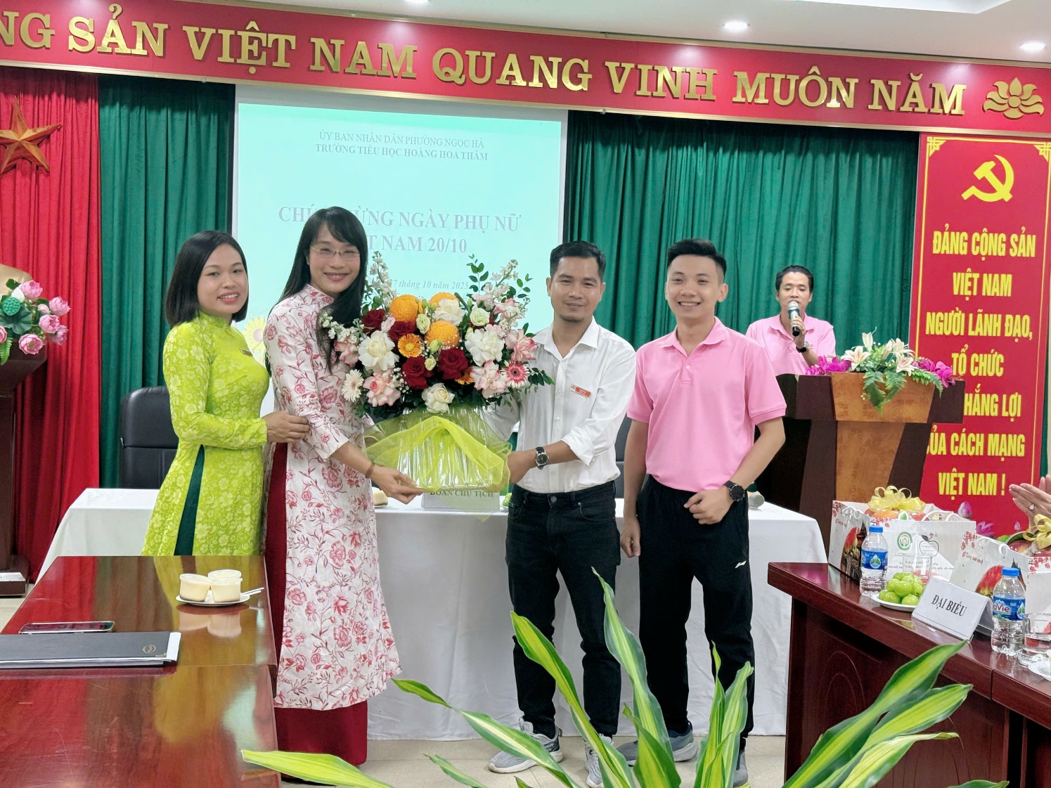 Không chỉ các em học sinh háo hức chuẩn bị những món quà nhỏ bé, mà các thầy giáo trong nhà trường cũng đã gửi tới đồng nghiệp nữ những bó hoa tươi thắm cùng lời chúc dịu dàng, tràn đầy yêu thương. Những món quà giản dị ấy chứa đựng bao tình cảm chân thành, thay cho lời tri ân sâu sắc gửi đến những người đồng nghiệp tận tụy, dịu dàng và giàu lòng nhân ái. Trong ánh mắt, nụ cười và những cái bắt tay thân tình, tình cảm đồng nghiệp như được gắn kết thêm bền chặt, để ngày 20/10 trở thành một kỷ niệm thật đẹp – đong đầy yêu thương, ấm áp và tràn ngập niềm vui.