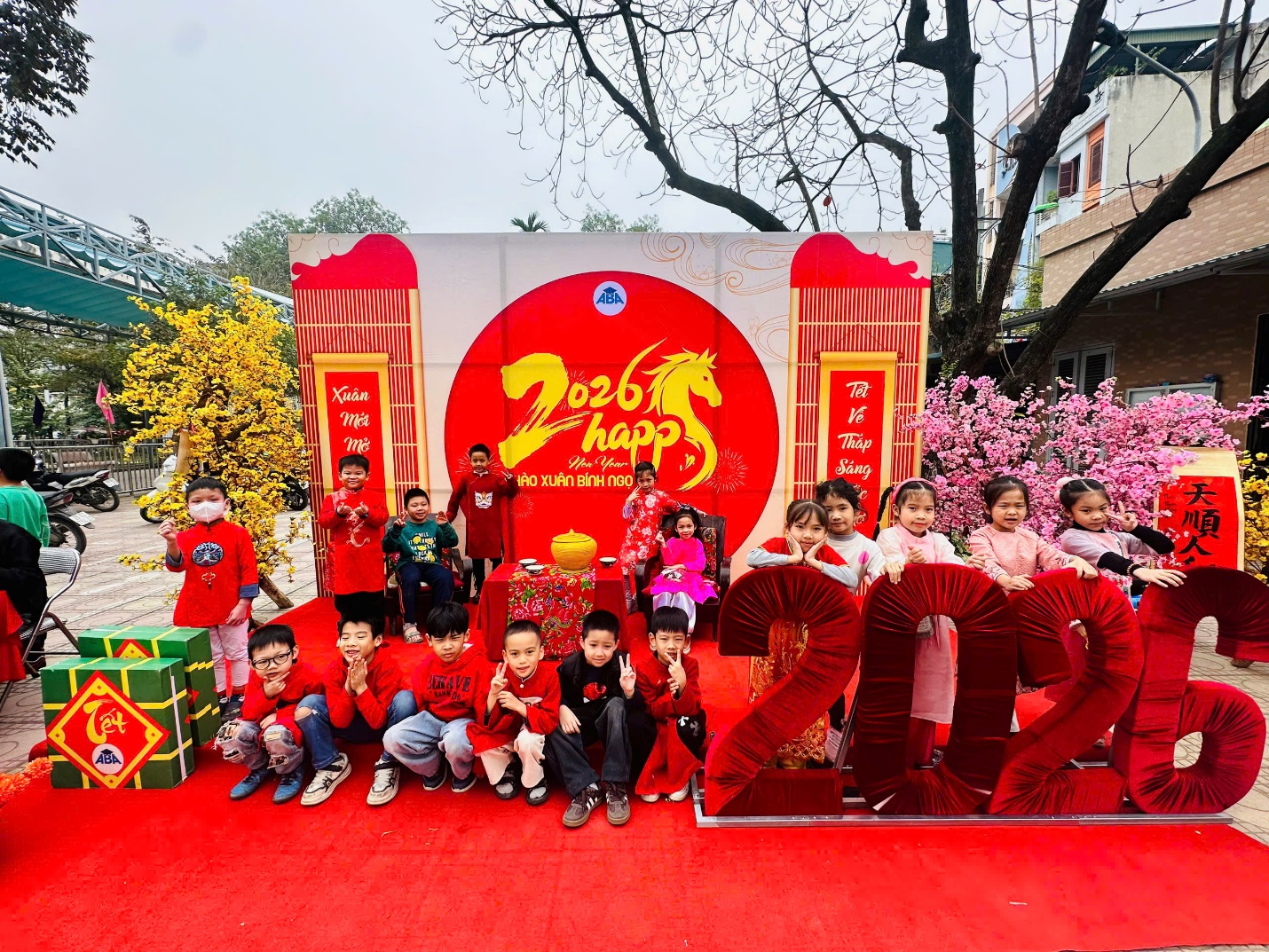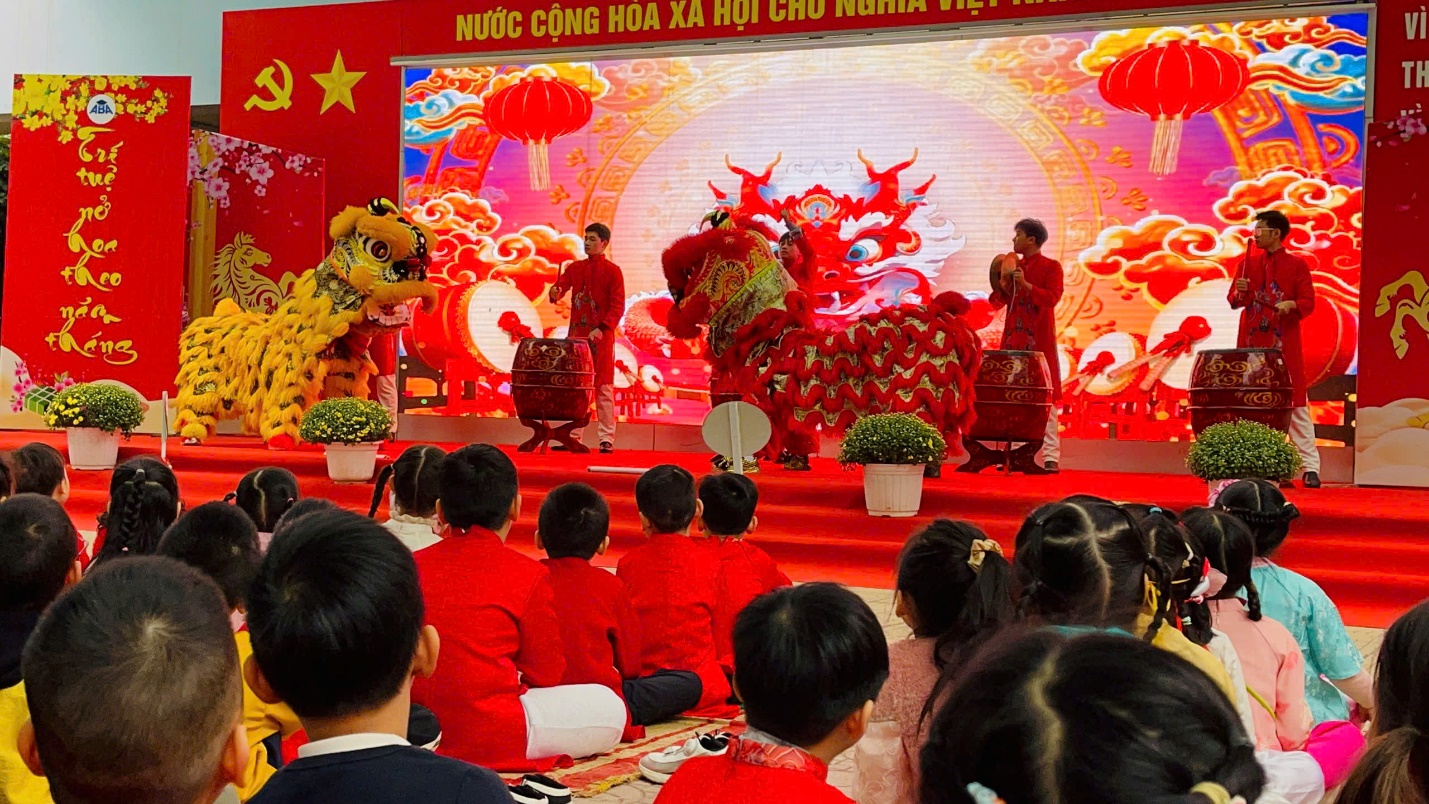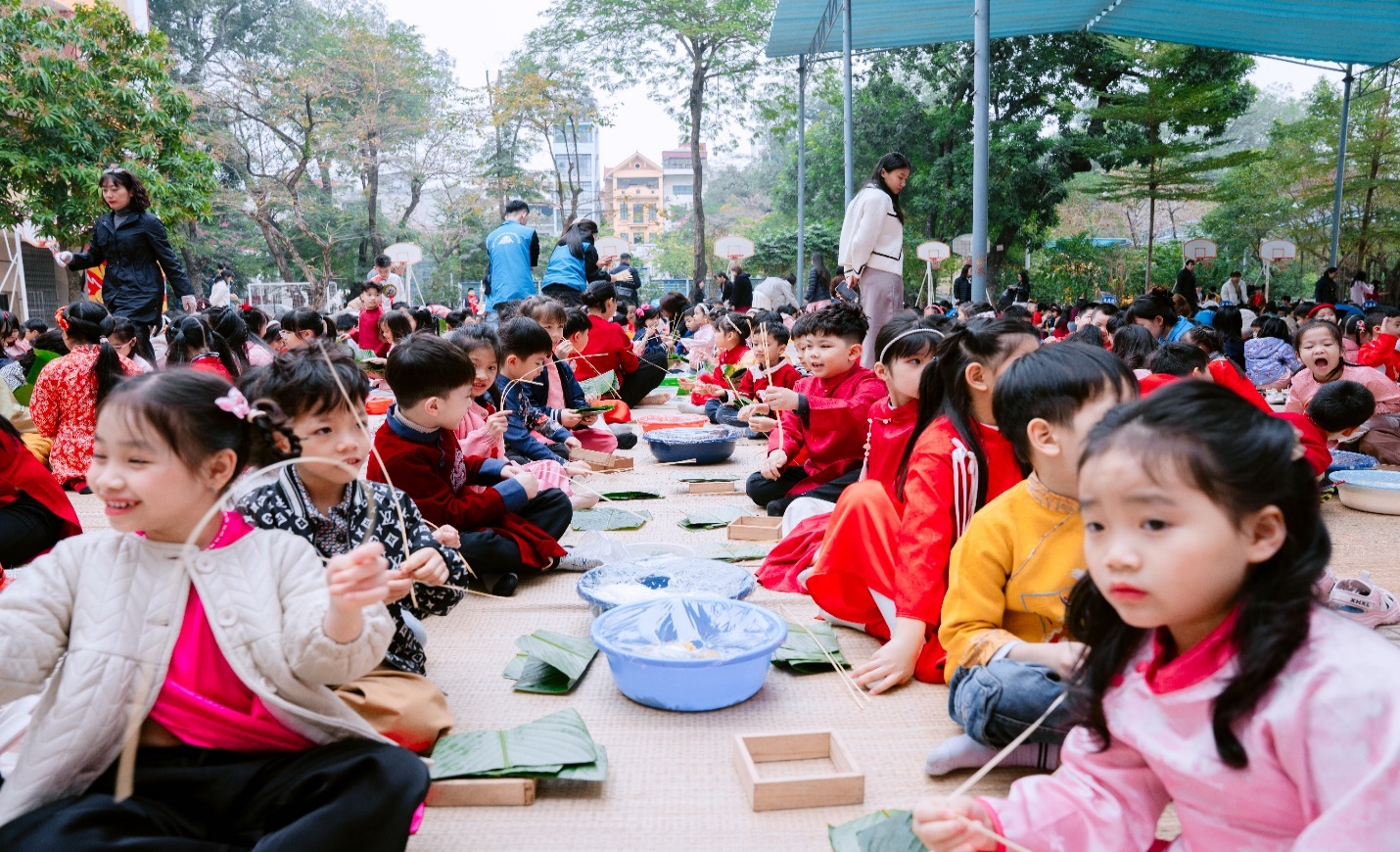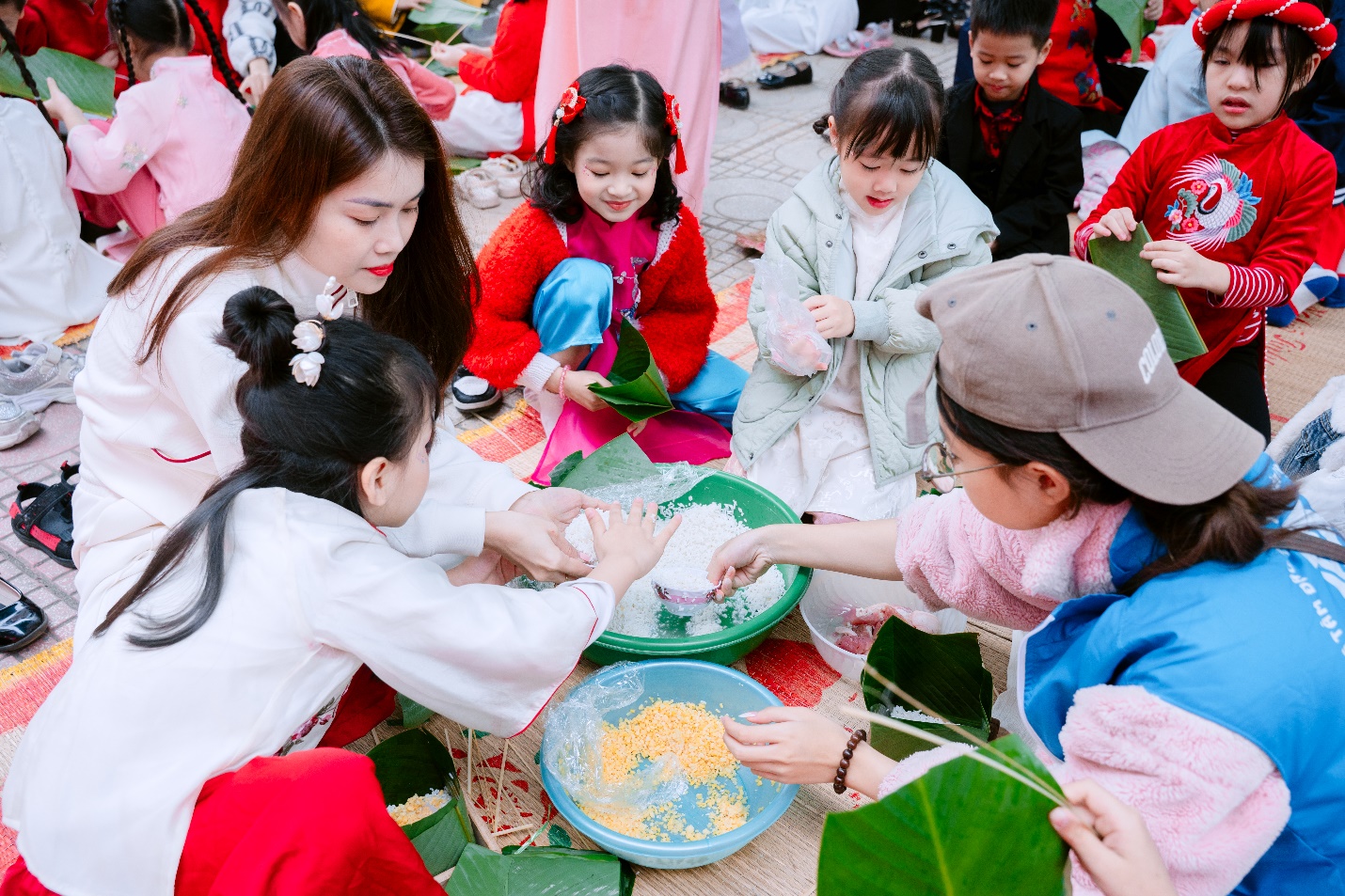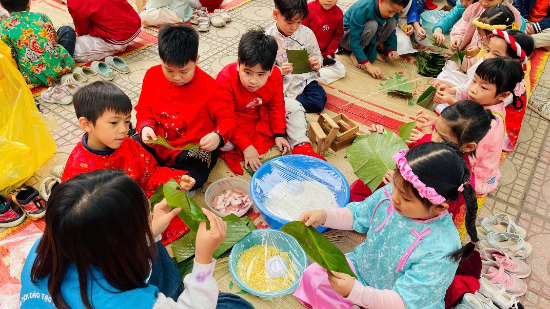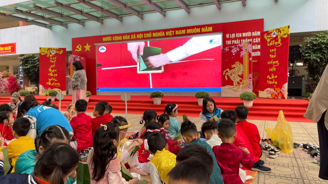 Từ sáng sớm, sân trường đã khoác lên mình tấm áo mới với hoa đào thắm, hoa mai vàng và những gian hàng lá dong xanh mướt. Dưới sự hướng dẫn tận tình của thầy cô và các bậc phụ huynh, các em học sinh đã được tự tay trải nghiệm quy trình làm nên chiếc bánh chưng truyền thống.