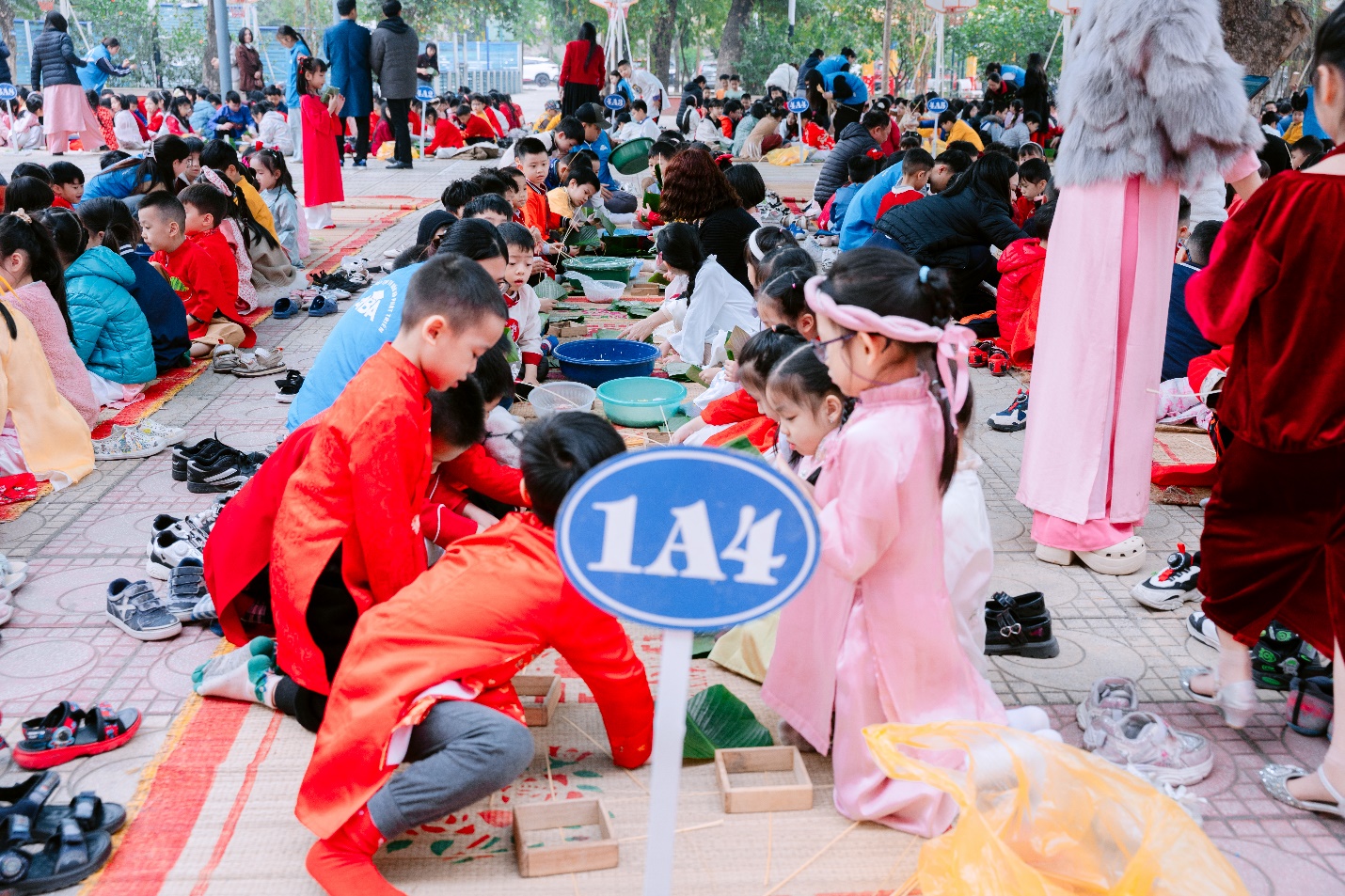 Đáng yêu nhất là hình ảnh các bạn nhỏ khối lớp 1. Lần đầu tiên được tham gia lễ hội lớn tại trường, các em không giấu nổi sự háo hức, đôi mắt tròn xoe chăm chú quan sát từng nhịp gấp lá, cách đặt lạt của thầy cô. Với sự tập trung cao độ, những đôi tay măng non tuy còn bỡ ngỡ nhưng đã rất nỗ lực để hoàn thành chiếc bánh chưng đầu đời của mình. Những chiếc bánh có thể chưa thật vuông vắn, cái to cái nhỏ, nhưng đó là thành quả của sự tỉ mẩn và lòng yêu kính nét đẹp cổ truyền.