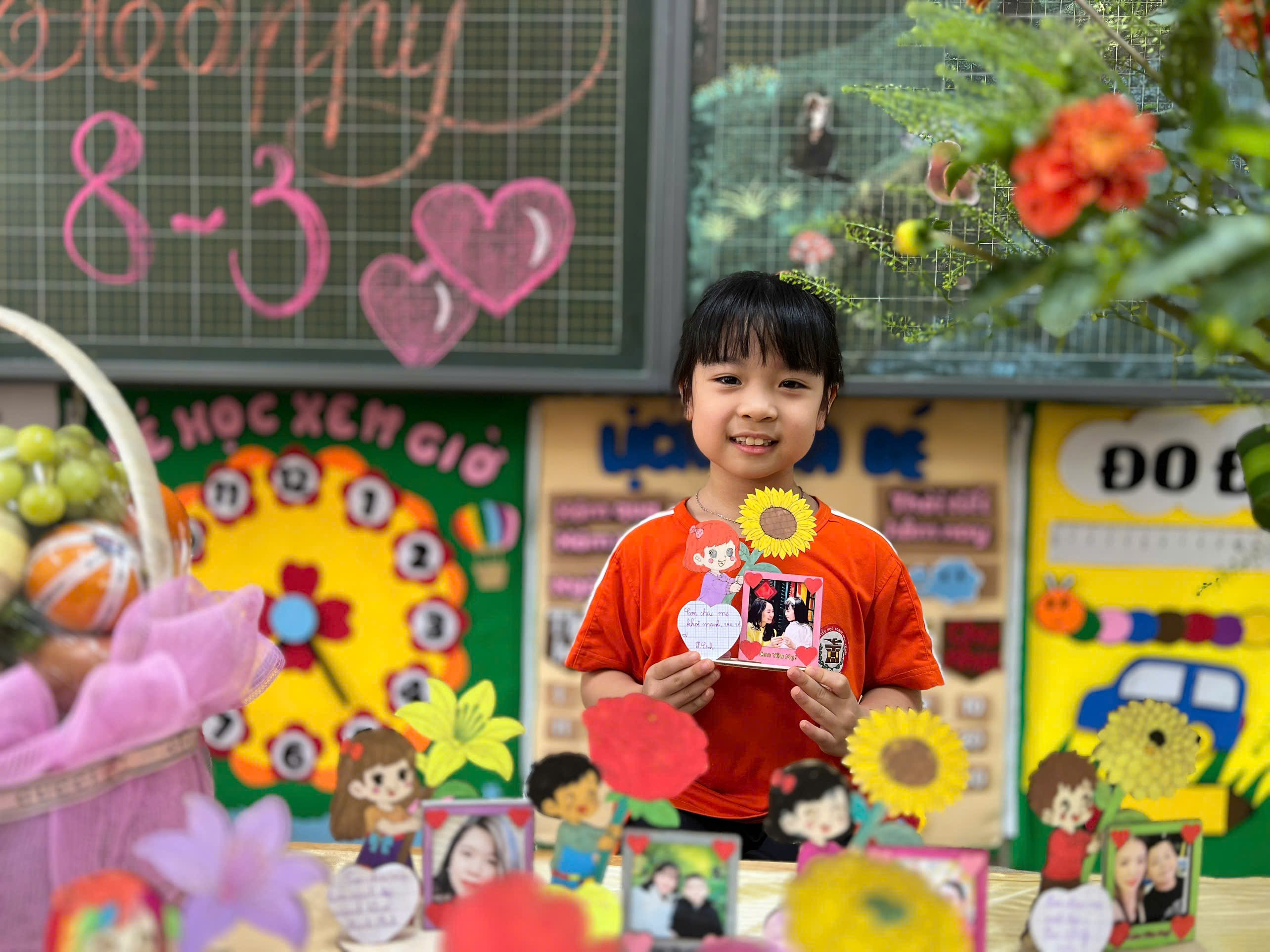 Các bạn lớp 1A1 và 1A3 đã khéo léo trang trí khung ảnh kèm những tấm thiệp xinh xắn dành tặng mẹ và cô giáo. Từng nét vẽ ngộ nghĩnh, từng gam màu rực rỡ được các em nâng niu như gửi gắm cả tình yêu và lòng biết ơn của mình.
