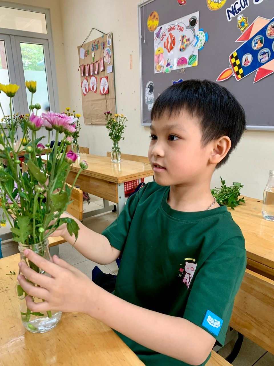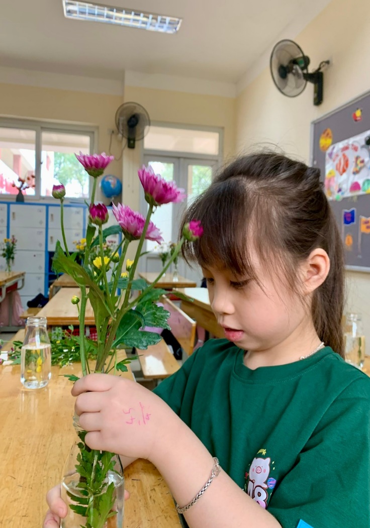 Lớp 1A4 và 1A8 lại mang đến những bình hoa tươi thắm qua hoạt động cắm hoa đầy khéo léo. Những bông hoa đủ sắc màu không chỉ làm đẹp thêm cho lớp học mà còn tượng trưng cho tình cảm trong sáng mà các em dành tặng những người phụ nữ mình yêu quý.