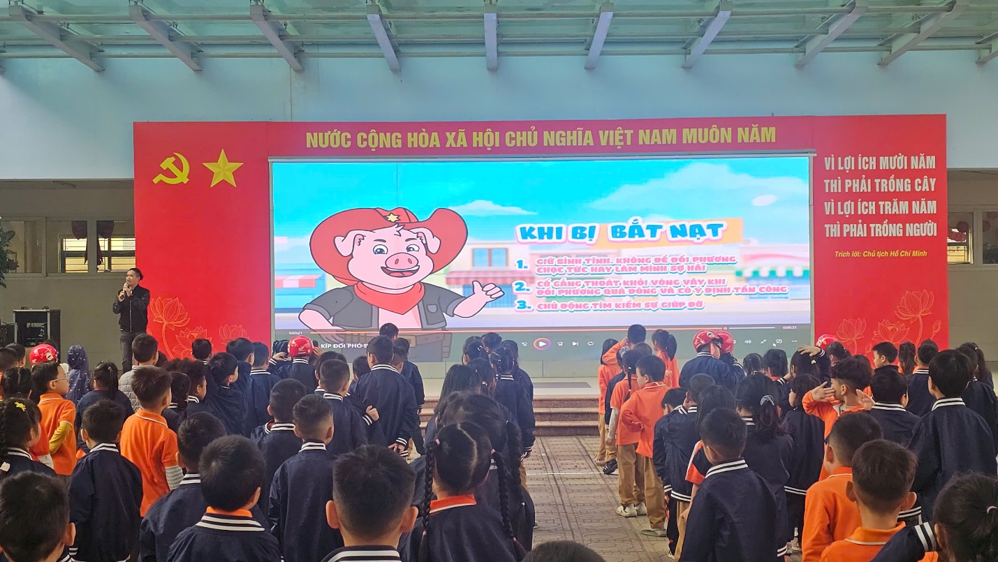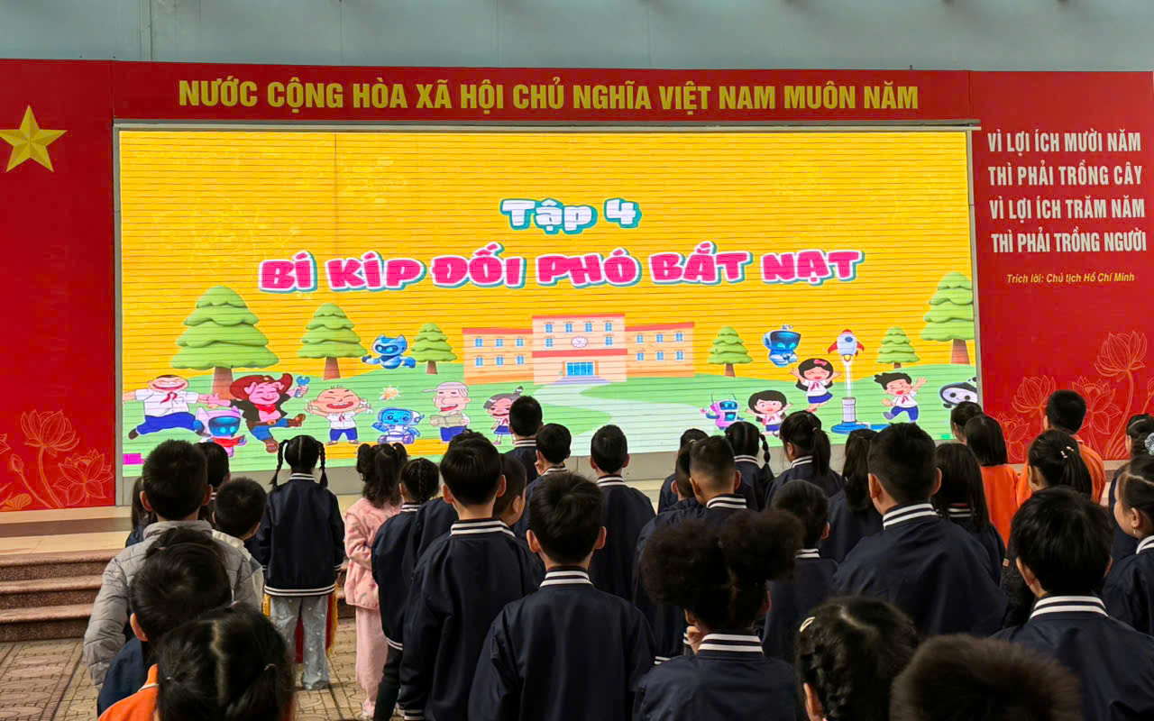Trong tiết sinh hoạt dưới cờ hôm nay các em học sinh được theo dõi tập phim “Bí kíp đối phó với bắt nạt”