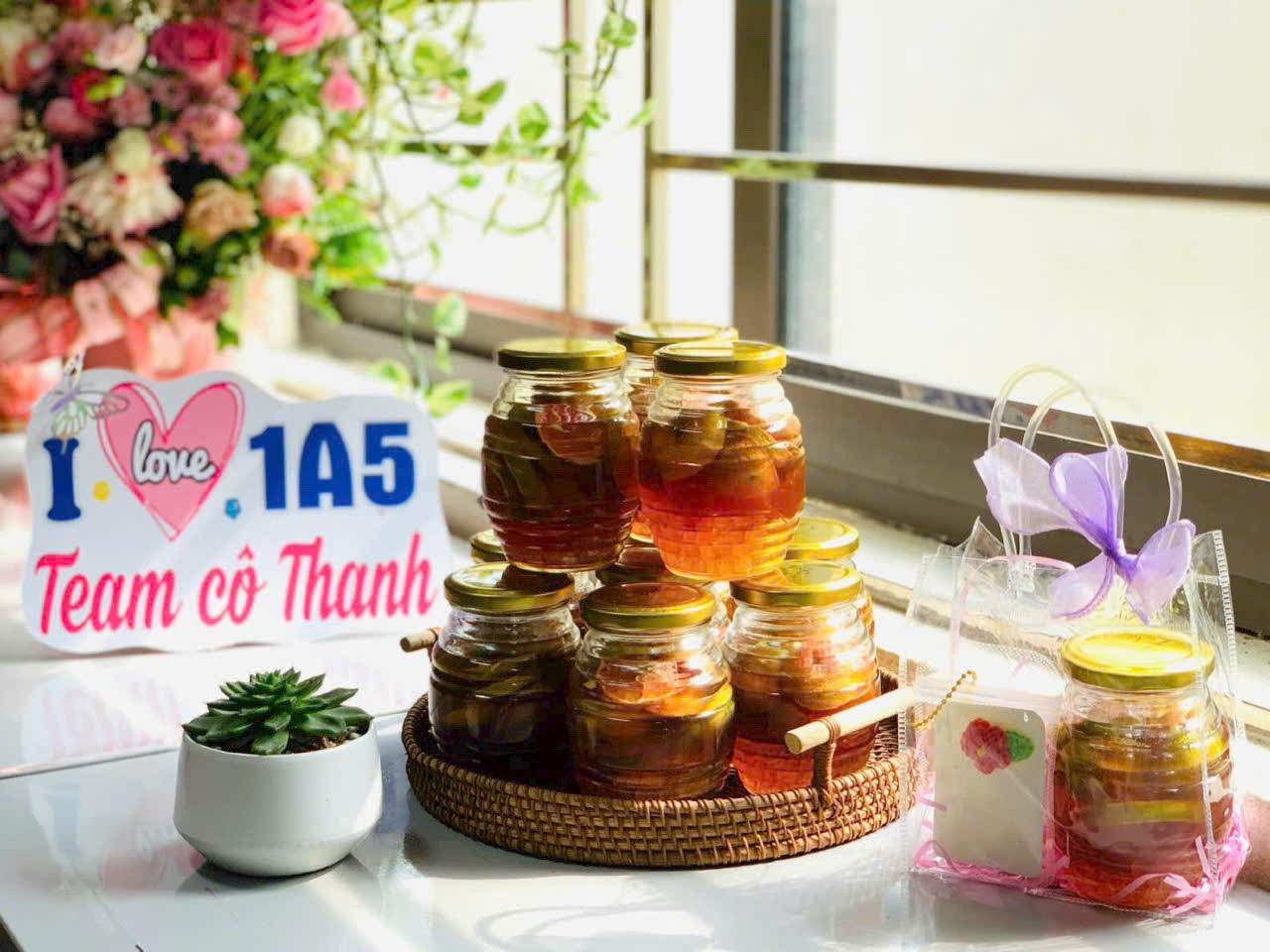 Khi những hũ chanh đào mật ong dần hoàn thiện, hương chanh dịu nhẹ hòa cùng vị ngọt của mật ong lan tỏa khắp lớp học. Các em tíu tít trang trí lọ quà bằng ruy băng, nhãn dán và thiệp nhỏ với dòng chữ đáng yêu:
