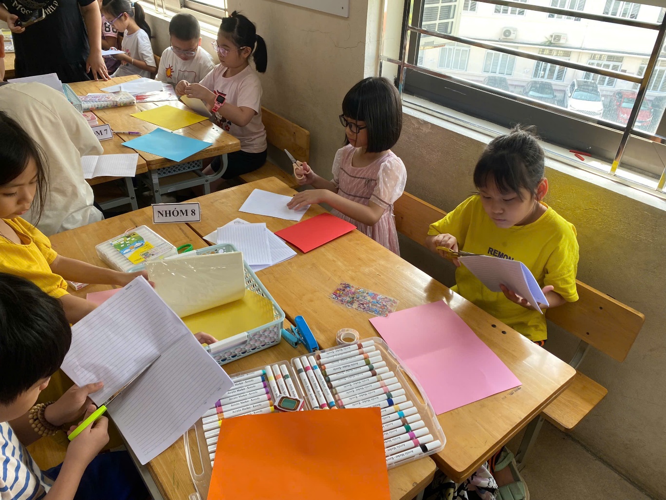 Dưới sự hướng dẫn nhẹ nhàng của cô giáo Trần Thuỳ Dương, các con được cùng nhau chia sẻ về những việc mình thường quên làm, thảo luận cách ghi chép để không bỏ sót nhiệm vụ. Không khí lớp học trở nên sôi nổi hơn khi các em tự tay trang trí “cuốn sổ nhắc việc” bằng giấy màu, bút chì và những hình vẽ ngộ nghĩnh, sticker thích thú gây lôi cuốn đến học sinh.