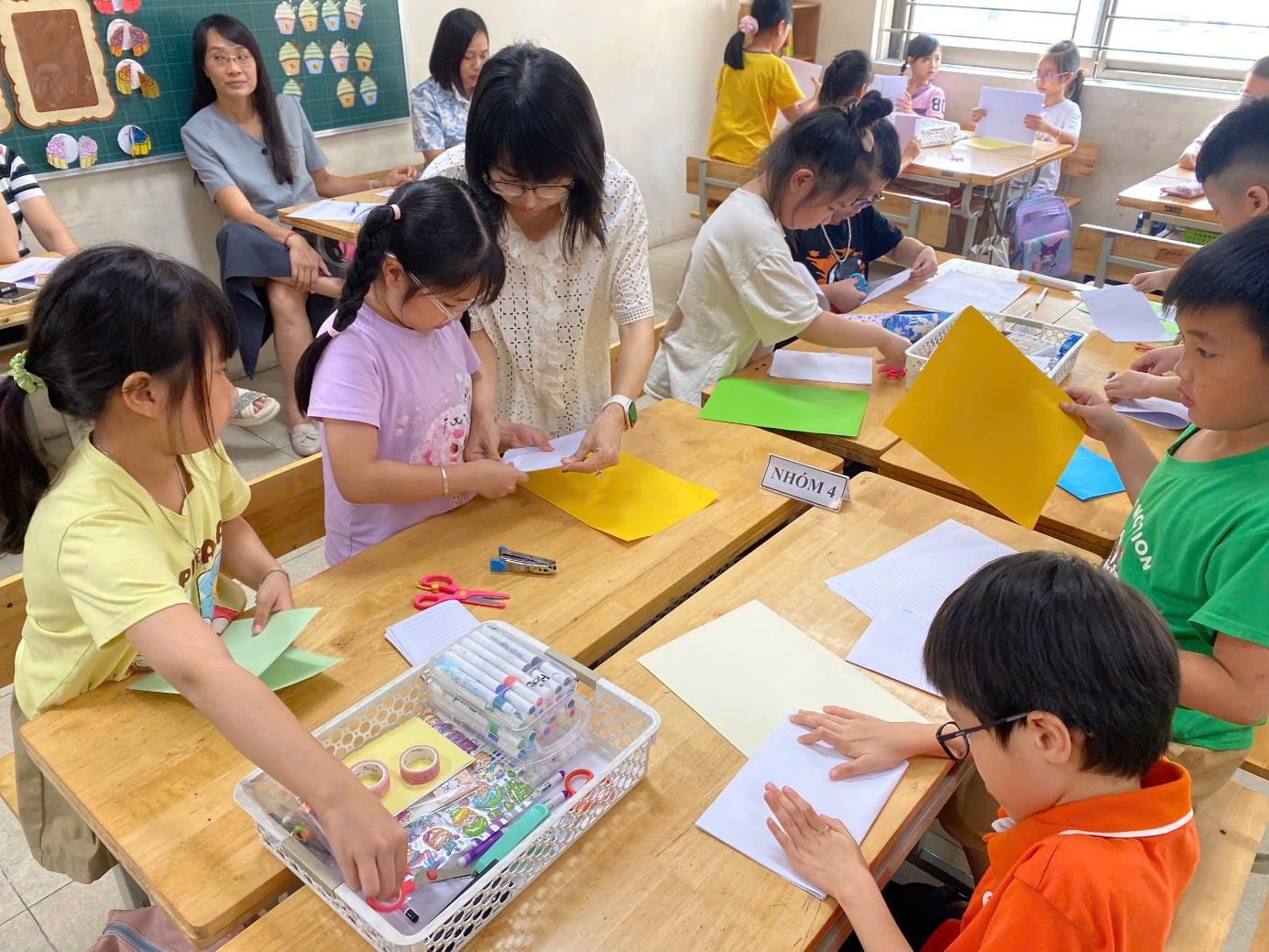Các bạn nhỏ lớp 3A5 đang cùng nhau thực hiện các bước với sự hướng dẫn của cô Thuỳ Dương