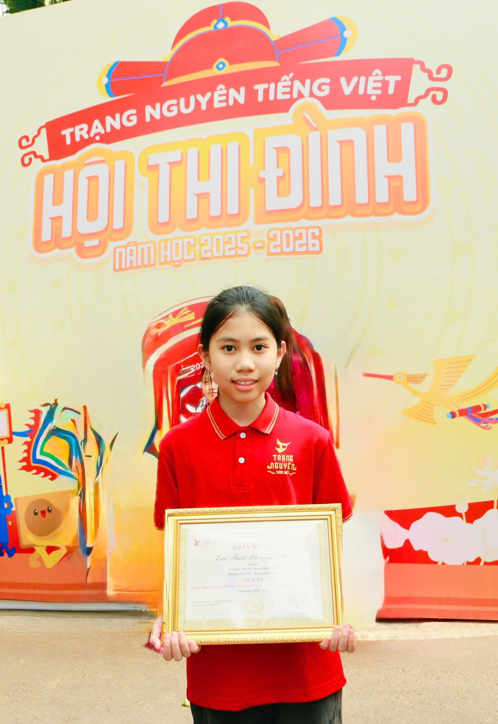 Thầy cô và bạn bè luôn tự hào về Bảo Hân – một cô bé không chỉ đẹp về ngoại hình mà còn sáng về trí tuệ và tâm hồn. Mong rằng Giải Ba cấp Quốc gia cuộc thi Trạng nguyên Tiếng Việt 2026 sẽ là bàn đạp vững chắc để em tiếp tục bay cao, bay xa, chinh phục những đỉnh cao mới trên con đường học vấn. Nhà trường hy vọng toàn thể các em học sinh noi gương Bảo Hân, lấy đây làm động lực để cùng nhau thi đua, học tập và rèn luyện, viết tiếp những trang sử vàng cho mái trường chúng ta.